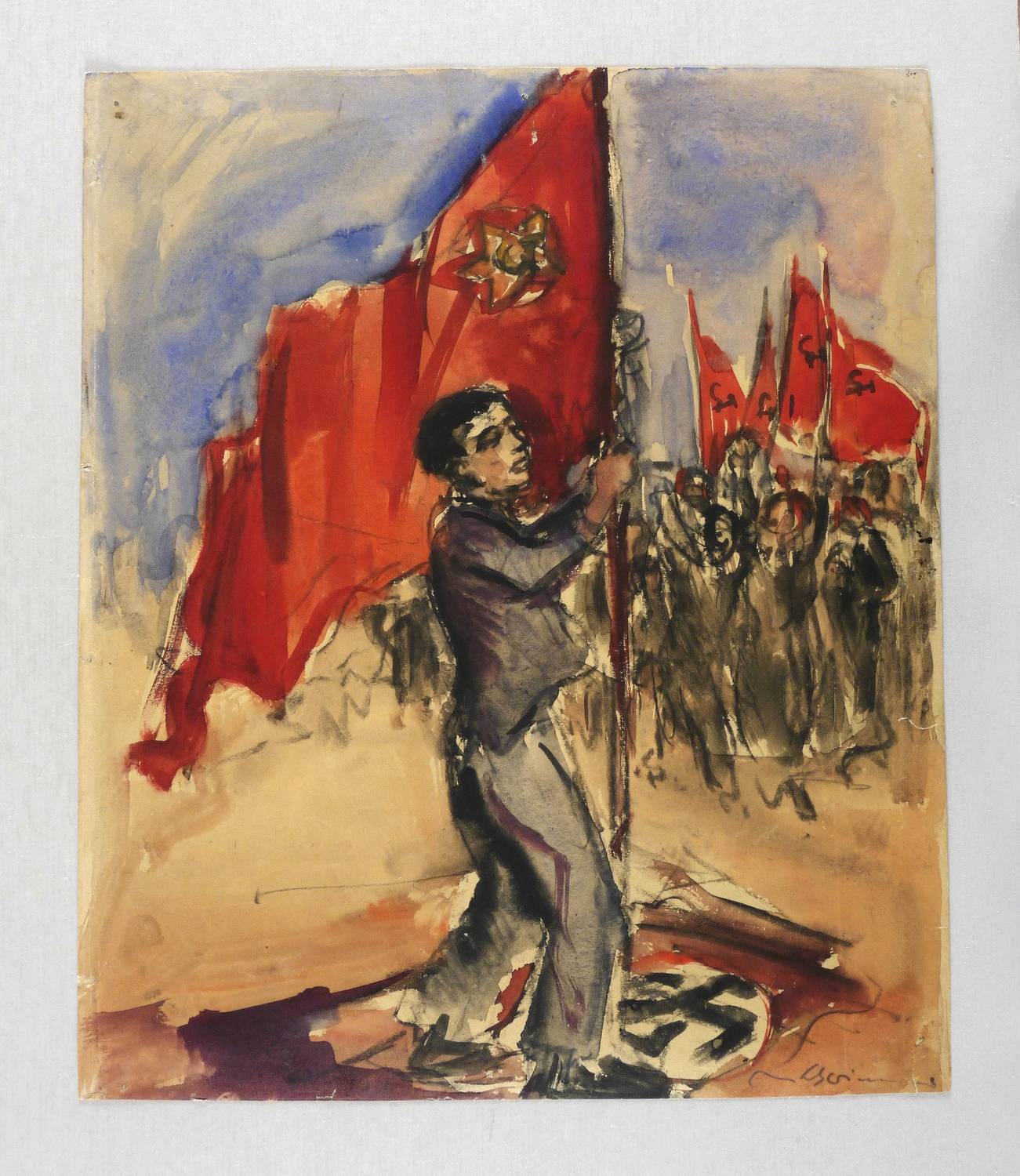 Rechts unten in Bleistift signiert: ″M Schwimmer″. – Nach Ende des Zweiten Weltkrieges, noch im Jahr 1945, trat Max Schwimmer in die KPD ein. Seit seiner Jugend stand er politisch fortschrittlichen Parteien nahe. 1924 entwarf er das Wahlplakat zu den Reichstagswahlen der USPD. – Leichte Randmängel. Insgesamt guter Zustand.