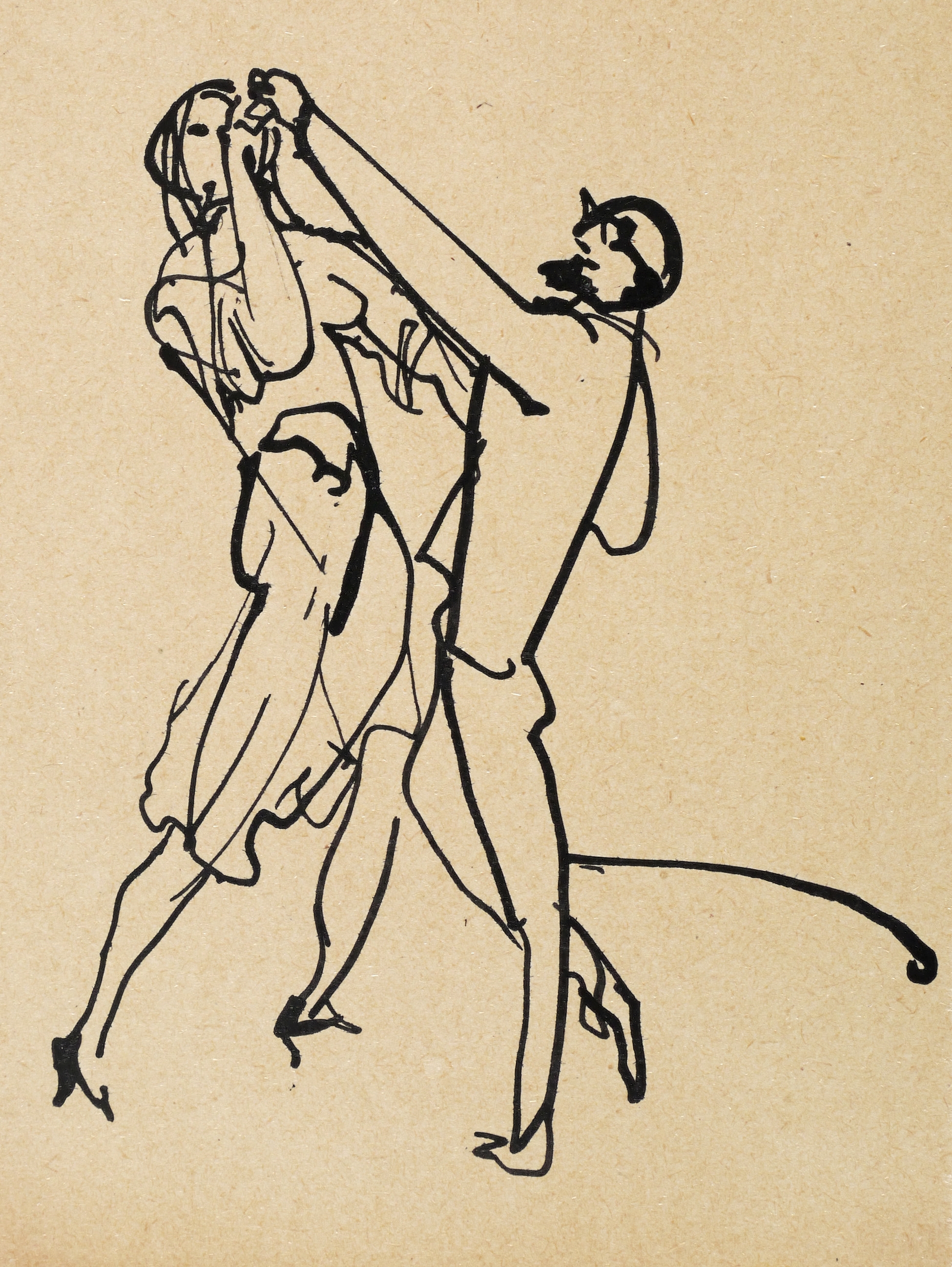 1949-1954. Zeichnung / Federzeichnung, in schwarzer Tusche, auf gelbem Postkartenkarton. – Originale Künstlergrafik, von Max Schwimmer. – Unikat. – 12,0 x 9,7 cm (Darstellung), 14,8 x 10,5 cm (Blatt).