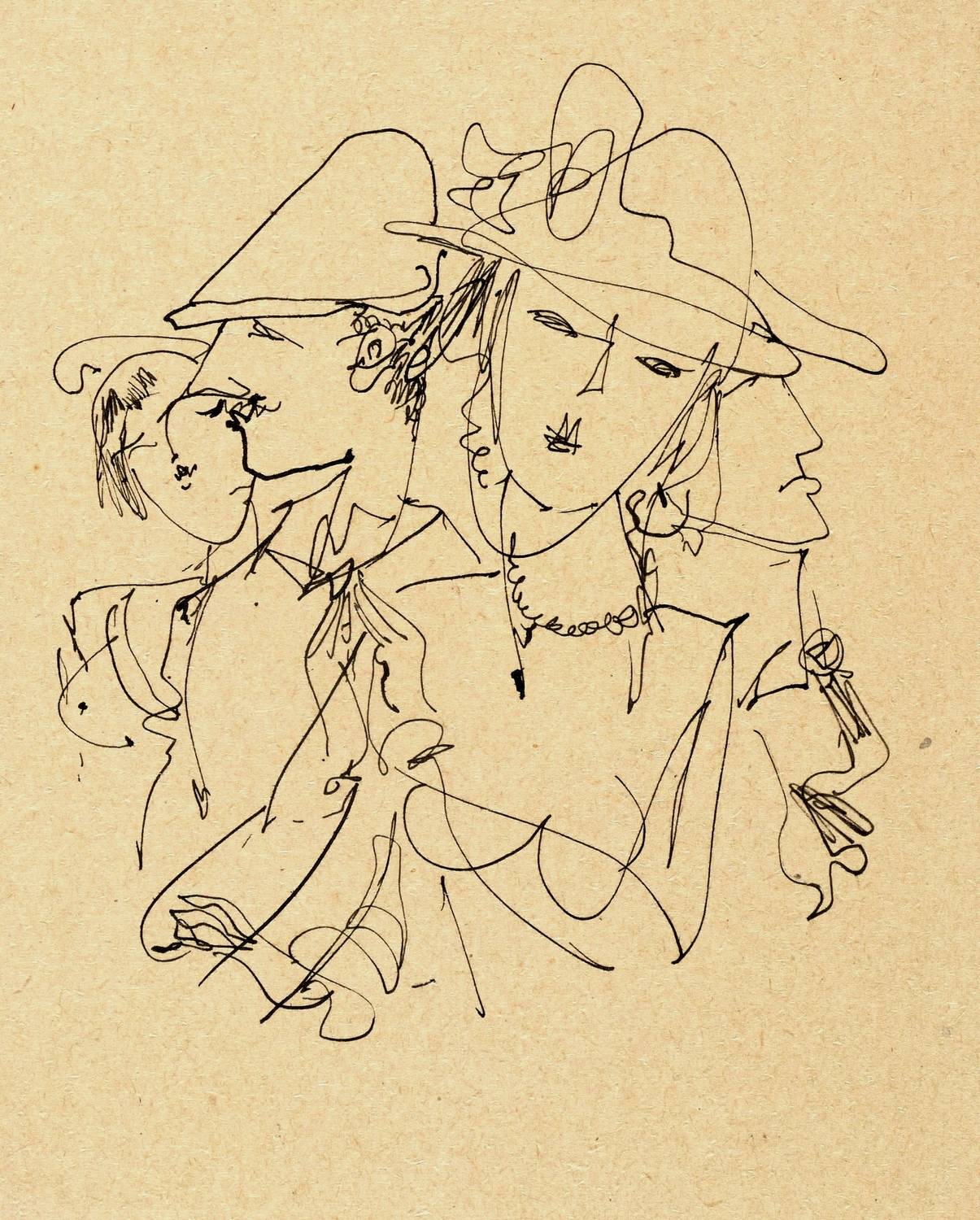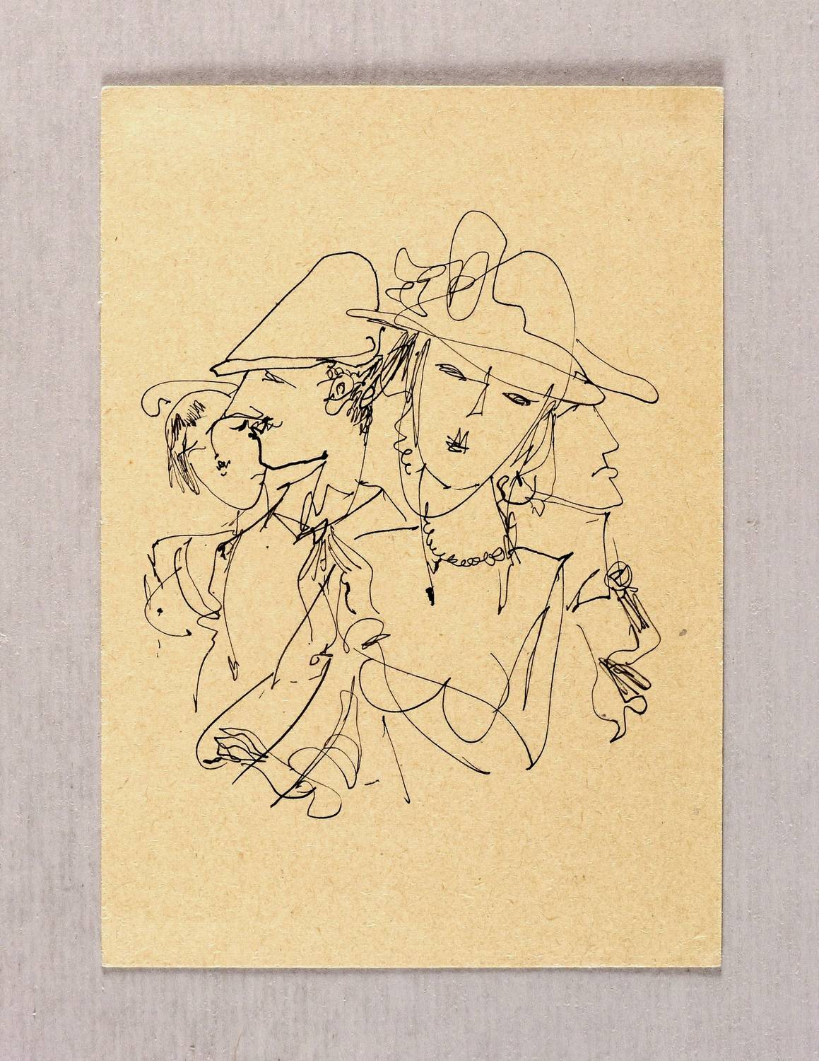1954/1955. Zeichnung / Federzeichnung, in schwarzer Tusche, auf gelbem Postkarten-Karton. – Originale Künstlergrafik, von Max Schwimmer. – Unikat. – 10,3 x 8,7 cm (Darstellung), 14,8 x 10,5 cm (Blatt).