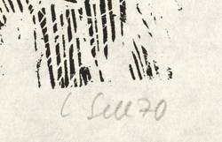 1970. Holzschnitt, in Schwarz, auf hellchamois Velin. – Originale Künstlergrafik, von Lothar Sell. – 22,0 x 13,0 cm (Darstellung / Druckbild), 29 x 26 cm (Blatt).