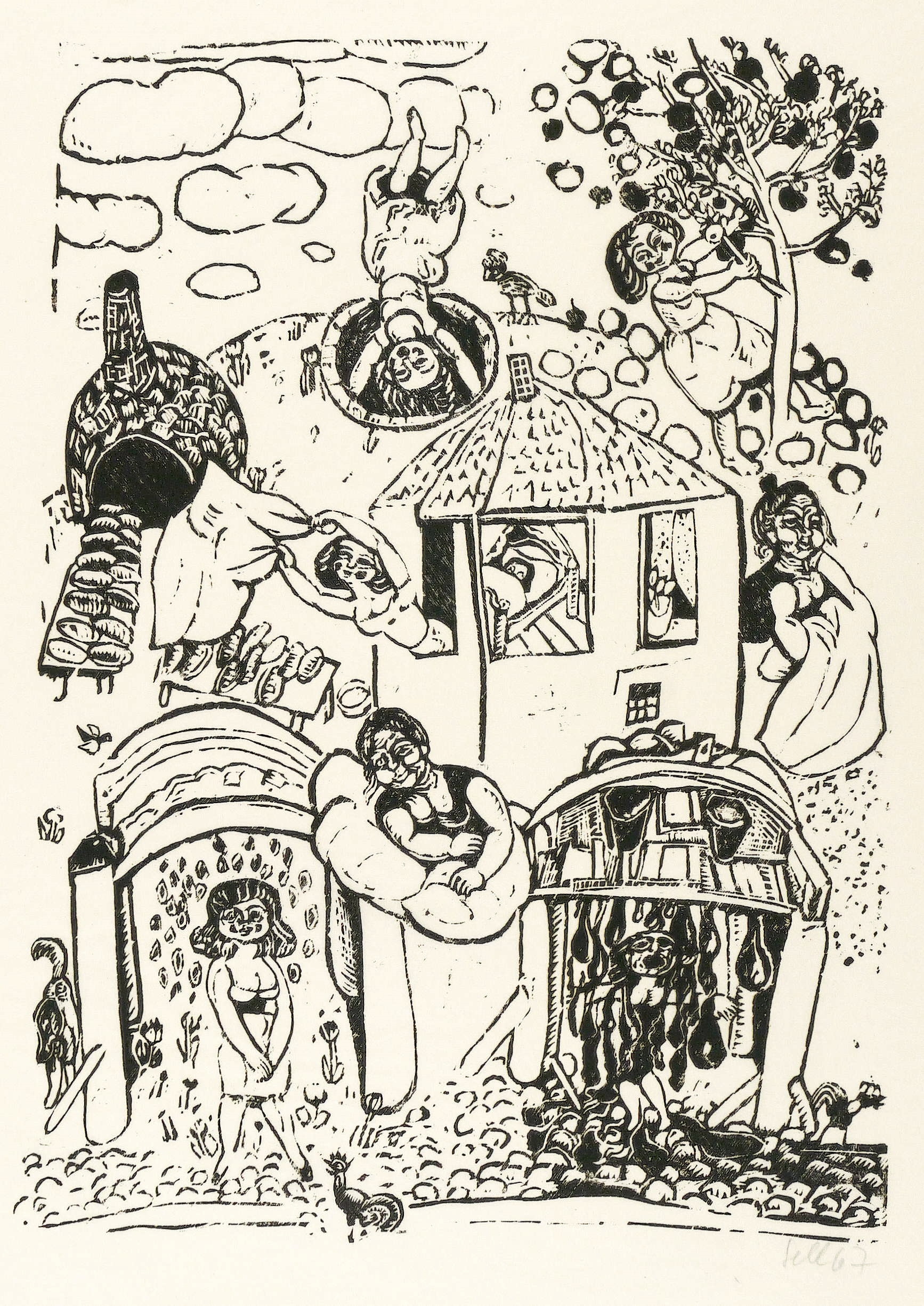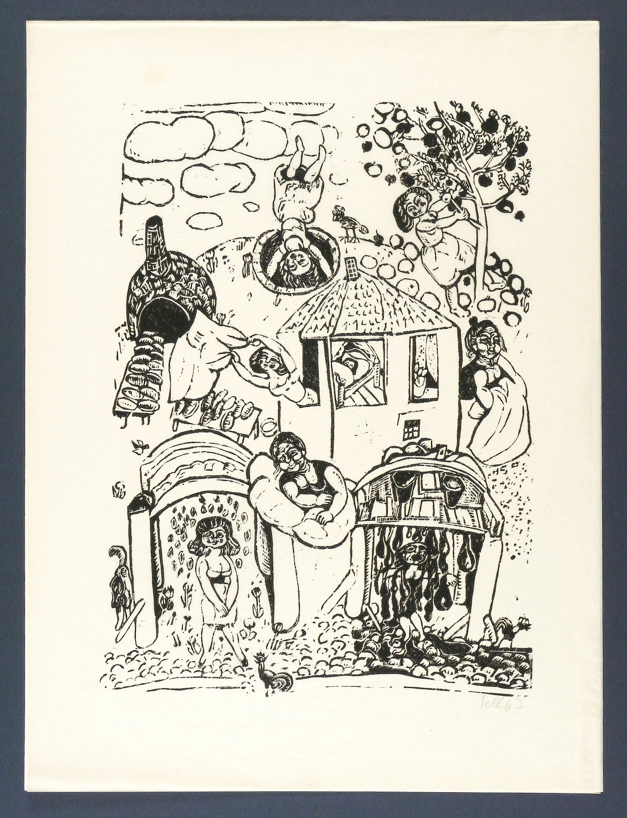 1967. Holzschnitt, in Schwarz, auf feinem hellem Transparentpapier. – Originale Künstlergrafik, von Lothar Sell. – 38,5 x 27,5 cm (Darstellung / Druckstock), 51 x 48 cm (Blatt).