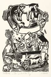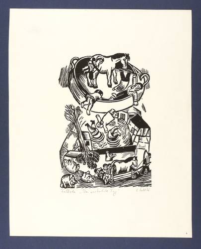 Lothar Sell (1939 Teuenbrietzen - 2009 Meißen). Deutscher Grafiker, Illustrator und Keramiker. 1957-63 Studium an der Hochschule für Bildende Künste Dresden (HfBK), bei Hans Theo Richter und Max Schwimmer. 1966-69 Meisterschüler an der Akademie der Künste Berlin (AdK). 1974-88 Lehrauftrag an der Burg Giebichenstein Hochschule für Kunst und Design in Halle. Mitglied im Verband Bildender Künstler der DDR. Seine Grafiken und Plastiken sind oft geprägt von einem humorigen "bäuerlichen" Charakter. Stilistisch dominiert deshalb eine oft derbe, zumeist auch naive Anmutung. 1976 Illustrationen zu Erwin Strittmatters "Ochsenkutscher". Die Leibesfülle, typisch für Sells Darstellung des menschlichen Körpers, charakterisiert u.a. die Keramiken des Brunnen im Meißner Zollhof.