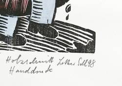 1998. Holzschnitt, in Schwarz, aquarelliert, auf weißem Velinkarton. – Originale Künstlergrafik, von Lothar Sell. – Auflage Exemplar Nr. 5/10. – 17,4 x 10,8 cm (Darstellung), 24 x 16 cm (Blatt).