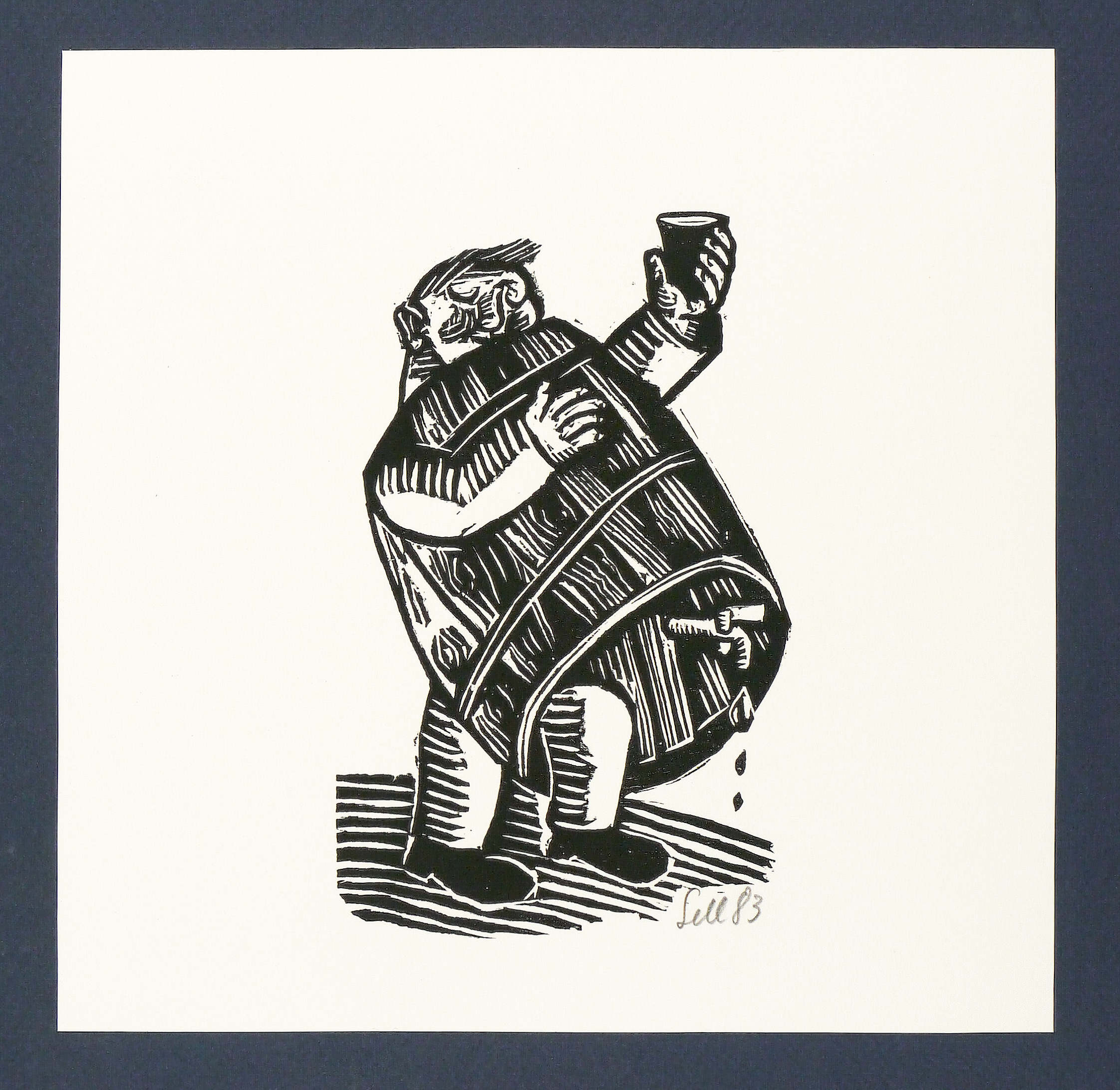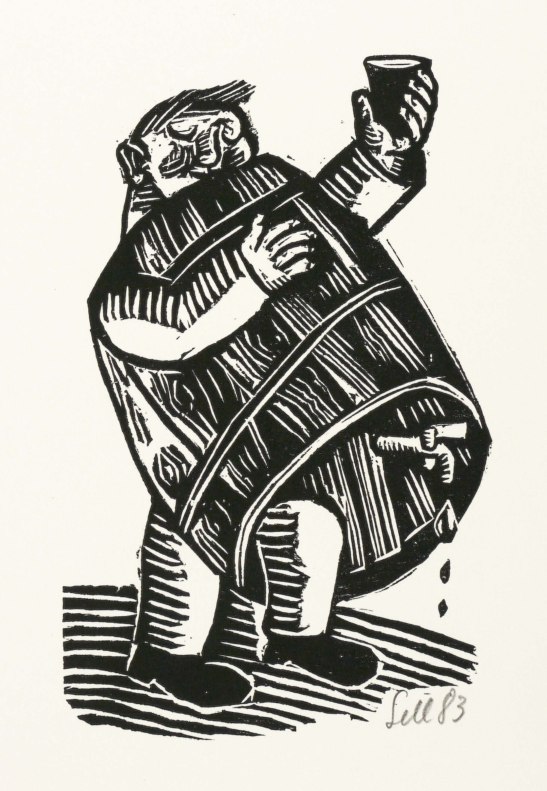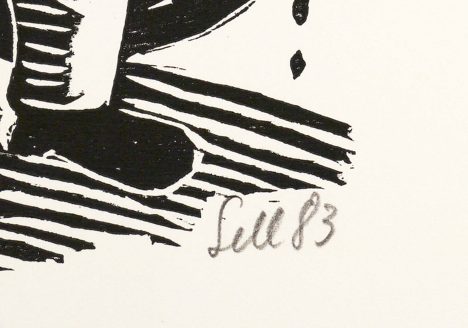1983. Holzschnitt, in Schwarz, auf weißem Velinkarton. – Originale Künstlergrafik, von Lothar Sell. – 14,6 x 9,1 cm (Darstellung), 20 x 20 cm (Blatt).