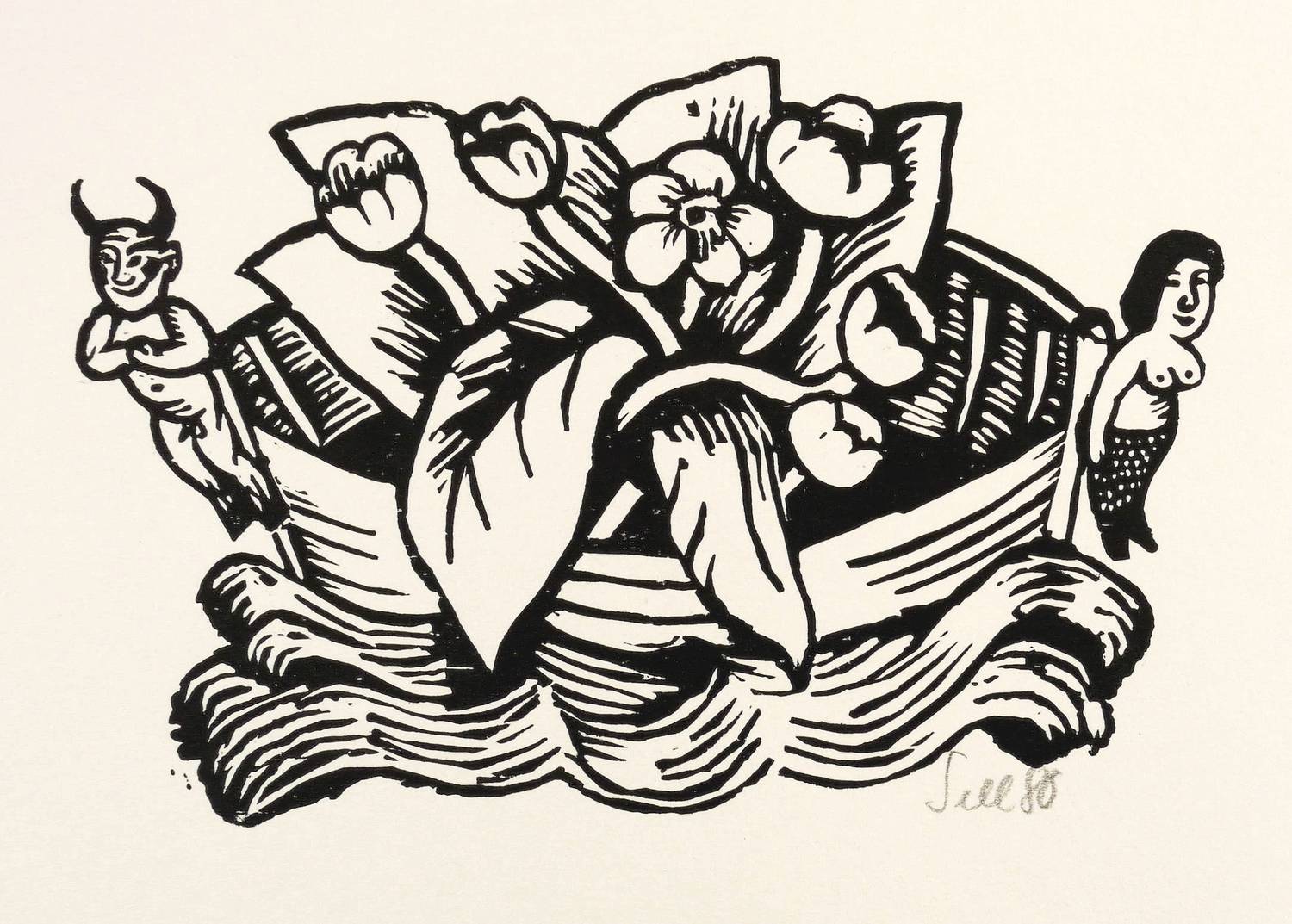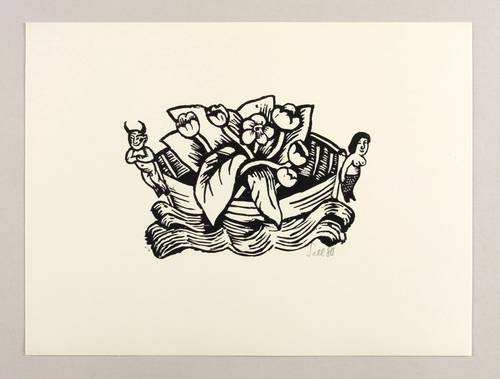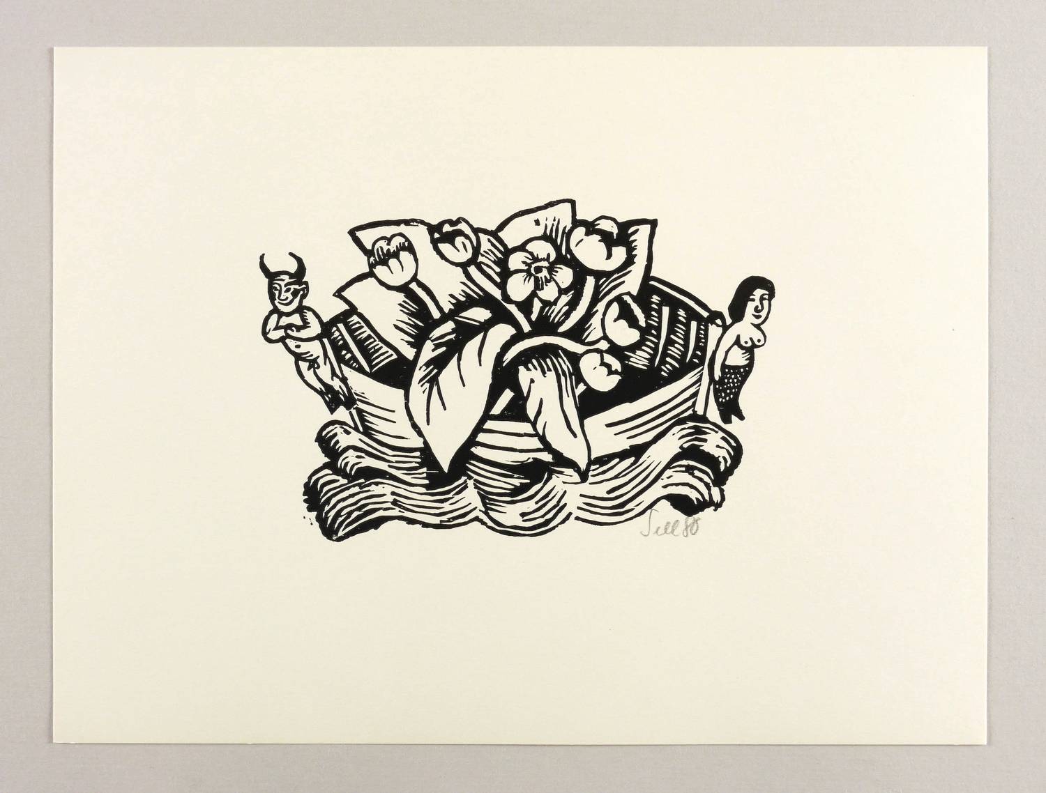 1980. Holzschnitt, in Schwarz, auf hellgelbem glattem Karton. – Von Lothar Sell. – 12,0 x 18,0 cm (Darstellung / Druckbild), 24 x 32 cm (Blatt).