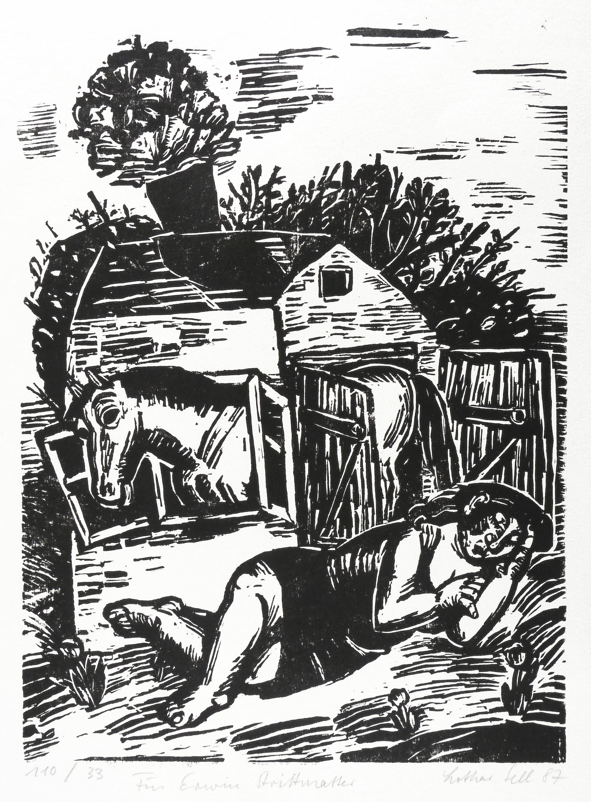 Sell, Lothar. – „Für Erwin Strittmatter (Schlafende vor Pferdestall)”.