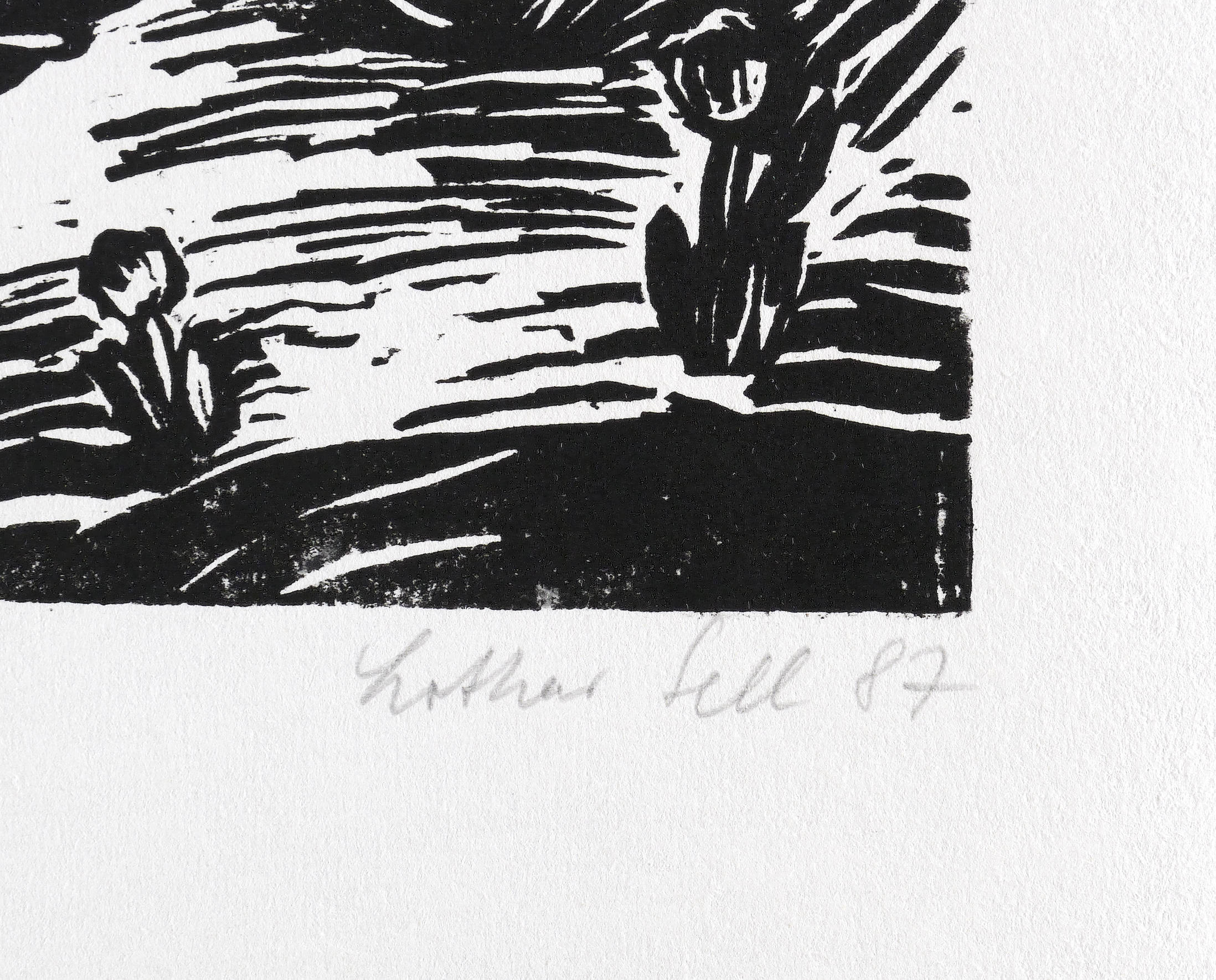 1987. Holzschnitt, in Schwarz, auf weichem wolkigem Velin. – Originale Künstlergrafik, von Lothar Sell. – Auflage Exemplar Nr. 33/110. – 39,5 x 29,0 cm (Darstellung / Druckstock), 49 x 36 cm (Blatt).