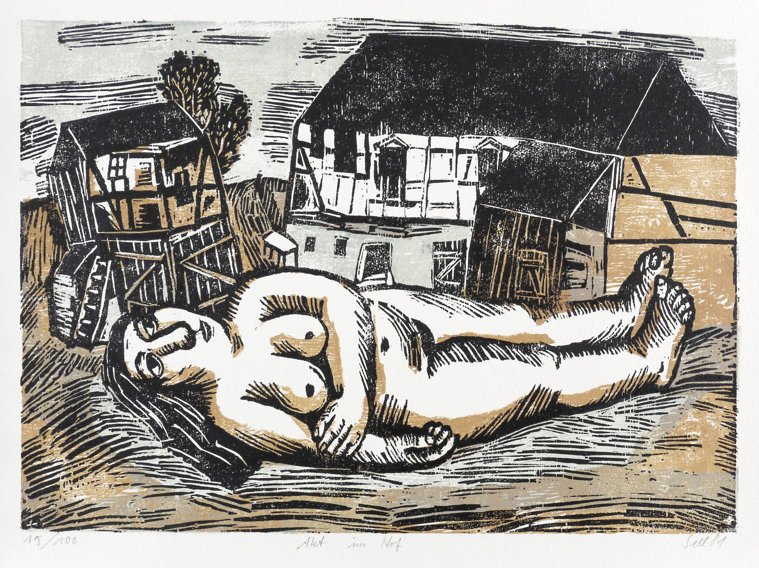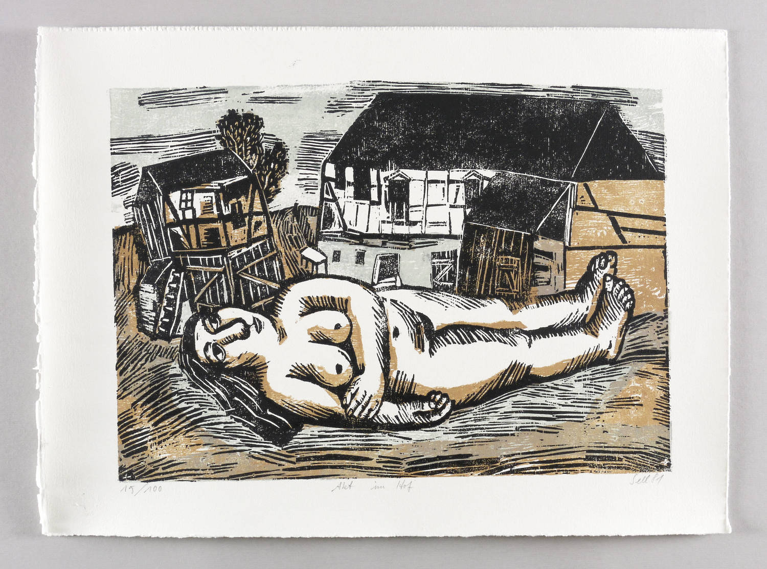 Rechts unten in Bleistift rechts unten signiert und datiert: ″Sell 81″. Links Auflagenbezeichnung: ″15/100″. Mittig Titel: ″Akt im Hof″. Wasserzeichen der Hahnemühle. – Hauptblatt des Künstlers! – Sehr schön erhalten. Sehr guter Zustand.