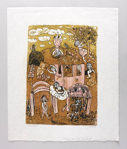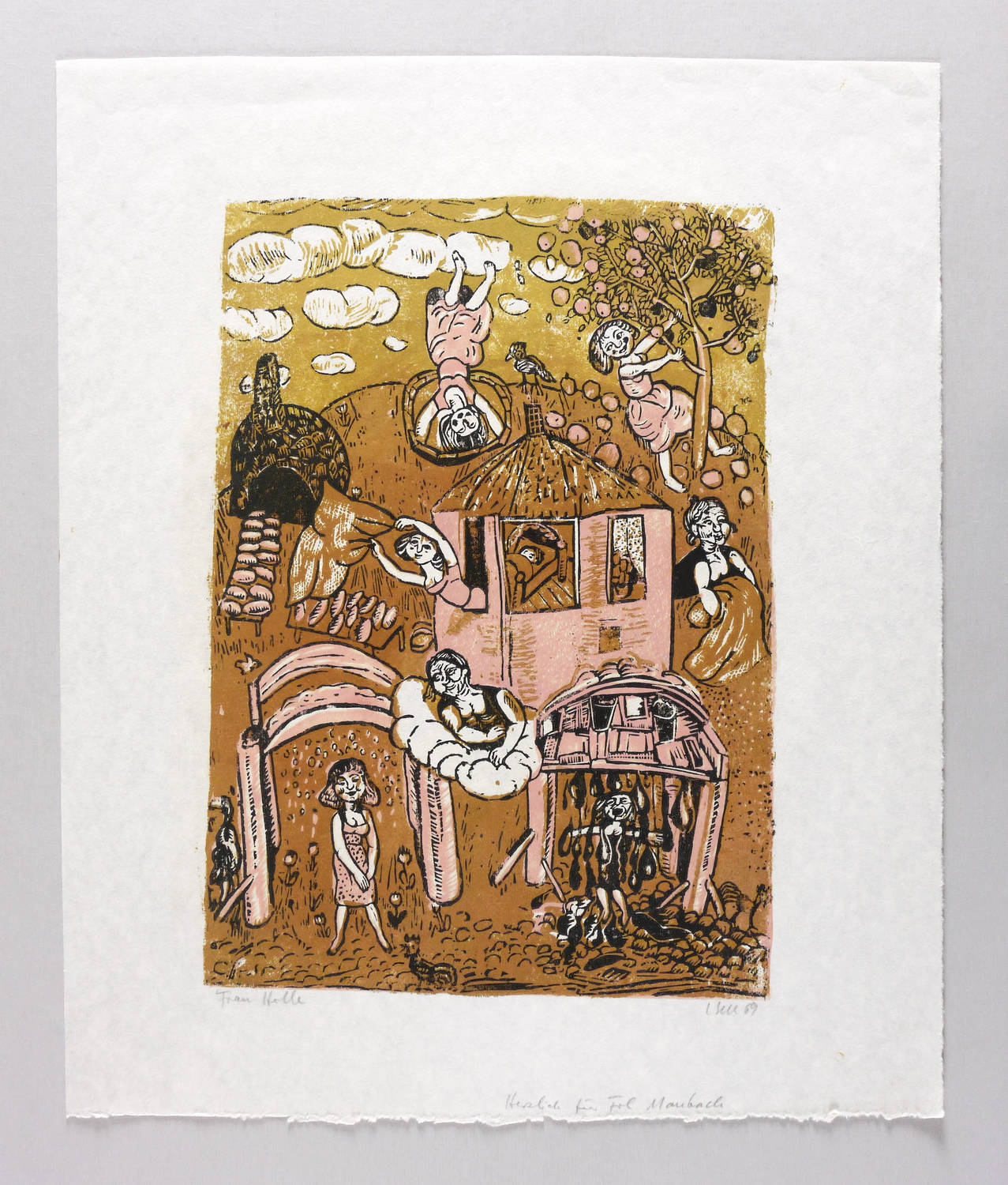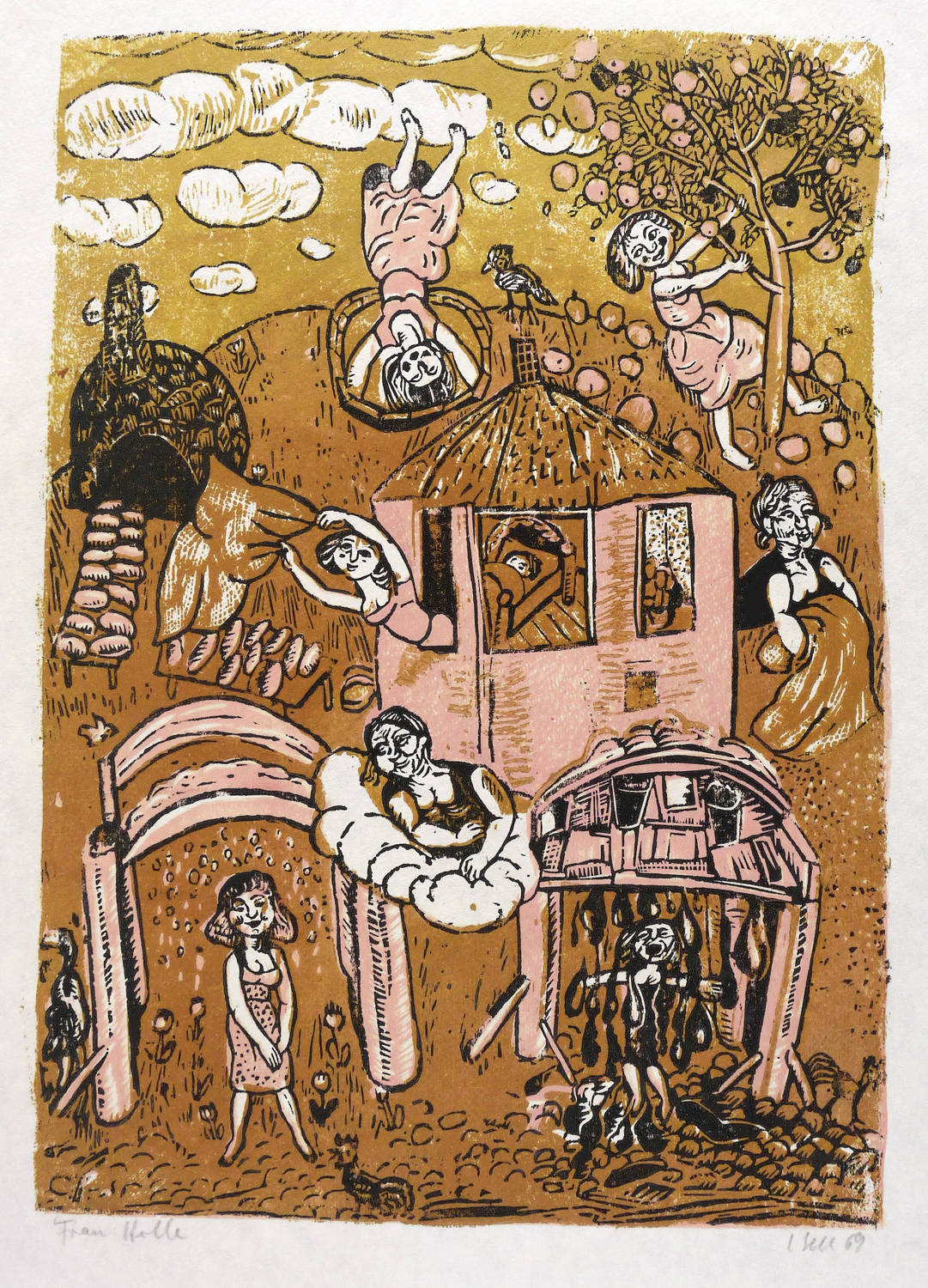 Aus: Lothar Sell, Grimms Märchen. 13. Druck der Kabinettpresse (Berlin: Kabinettpresse 1969). – Rechts unten in Bleistift signiert und datiert: ″L. Sell 69″. Links Titel: ″Frau Holle″. Im unteren Blattrand Widmung des Künstlers. – Sehr gut erhalten. Schönes Exemplar.