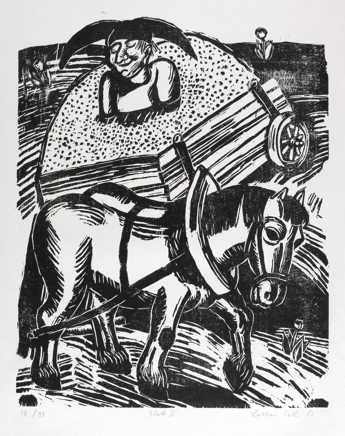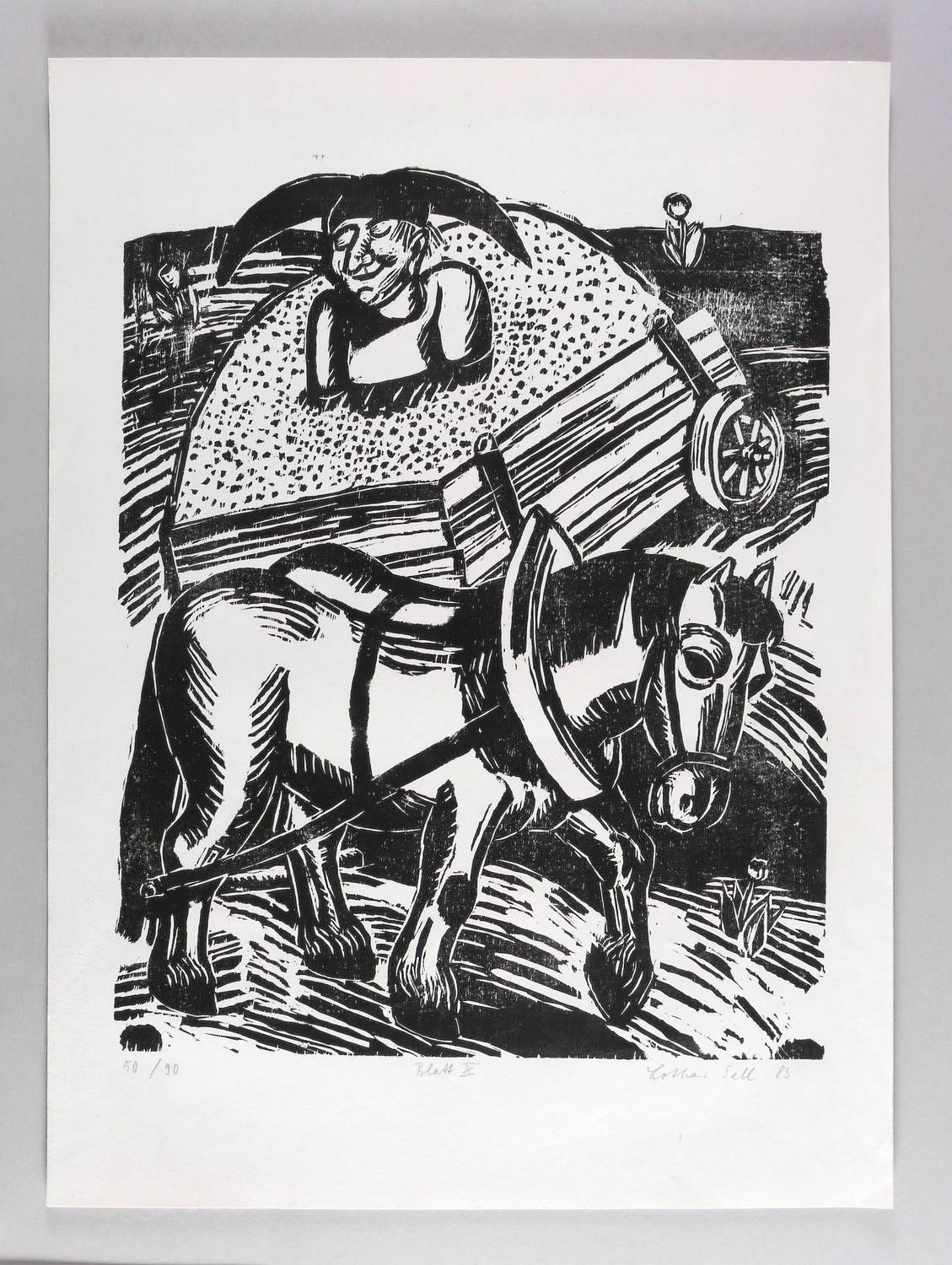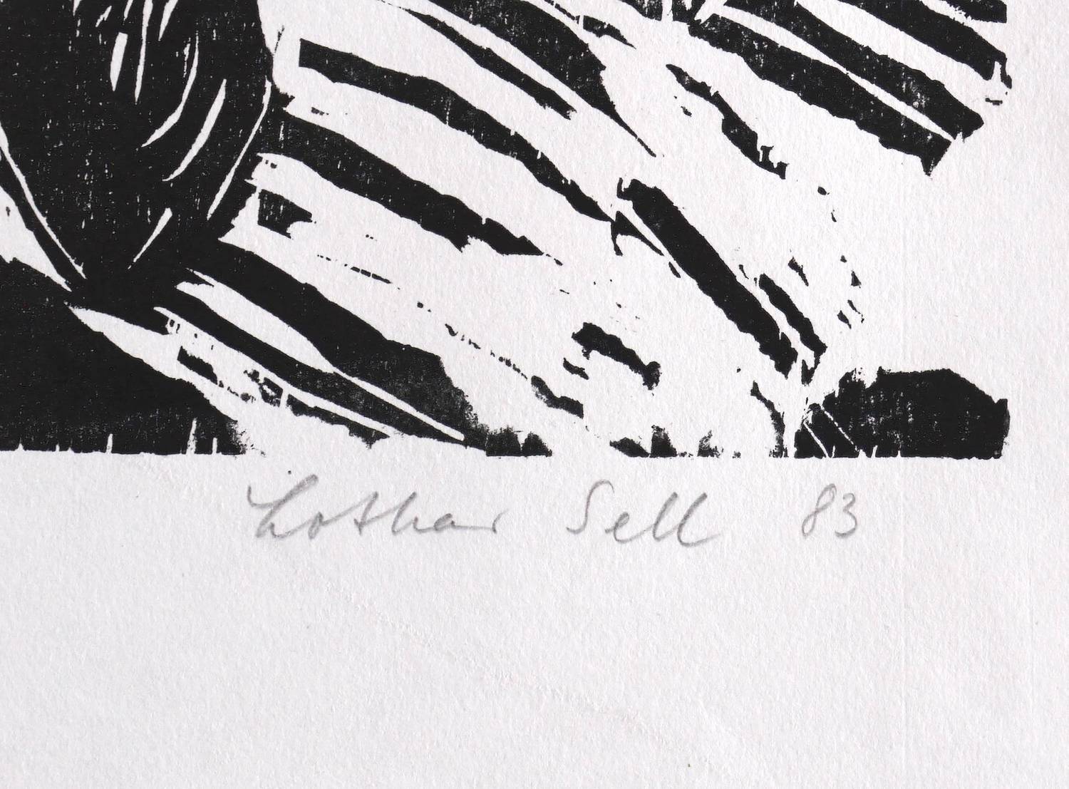 1983. Holzschnitt, in Schwarz, auf weichem weißlichem Velin. – Originale Künstlergrafik, von Lothar Sell. – Auflage Exemplar Nr. 50/90. – 62,7 x 50,1 cm (Darstellung / Druckbild), 60 x 81 cm (Blatt).