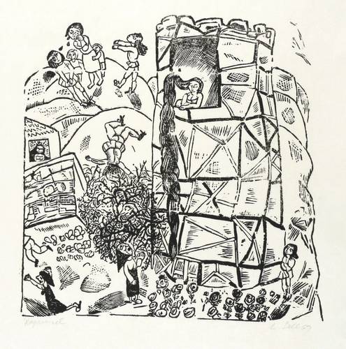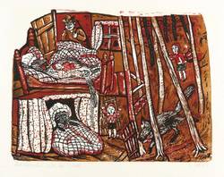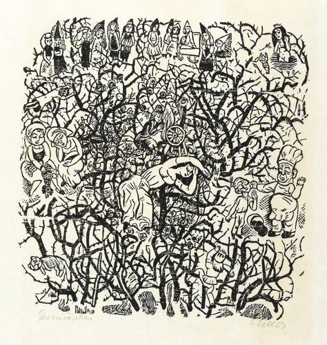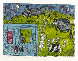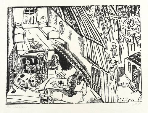Aus: Lothar Sell, Grimms Märchen. 13. Druck der Kabinettpresse (Berlin: Kabinettpresse 1969). – Alle Holzschnitte einschließlich dem Außentitel unten in Bleistift signiert und datiert: ″L. Sell 69″. Handschriftliche Auflagenbezeichnung im Impressum. – Originale Grafikmappe von Lothar Sell für die Kabinettpresse Berlin. Mit dem speziell für diese Grafikmappe verfassten Begleittext von Franz Fühmann. Enthalten sind 7 Holzschnitte und 3 Farbholzschnitte: 0a. [Außentitel]. - 0b. [Innentitel]. - 1. Das Waldhaus. - 2. Die goldene Gans. - 3. Frau Holle. - 4. Rapunzel. - 5. Die Bremer Stadtmusikanten. - 6. Der Wolf und die sieben Geißlein. - 7. Dornröschen. - 8. Rotkäppchen und der Wolf. – Vollständig mit Umschlag und Außentitel, mit Impressum, Textblatt und allen Grafiken. Der Umschlag minimal berieben und fingerspurig. Die Blätter bisweilen unscheinbar gewellt. Schönes Exemplar. Guter bis sehr guter Zustand.