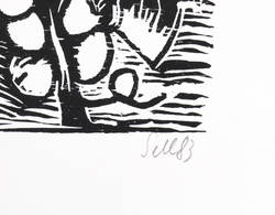 1983. Holzschnitt, in Schwarz, auf glattem weißem Velinkarton. – Originale Künstlergrafik, von Lothar Sell. – 18,2 x 16,9 cm (Darstellung / Druckbild), 26 x 22 cm (Blatt).