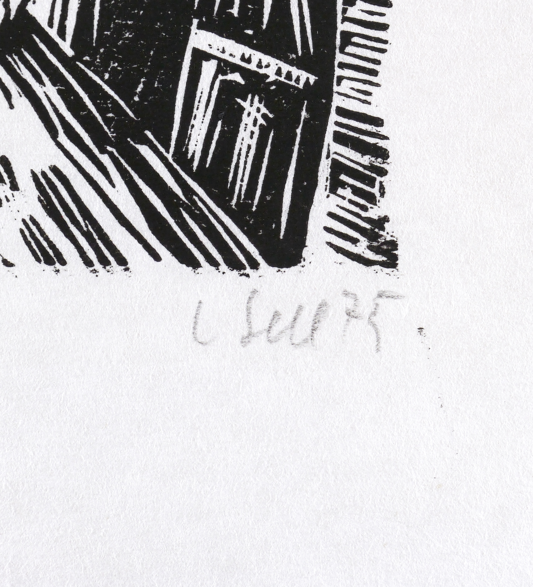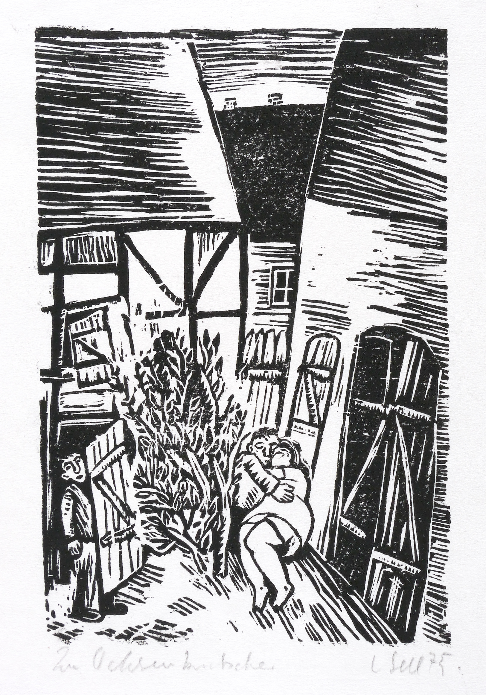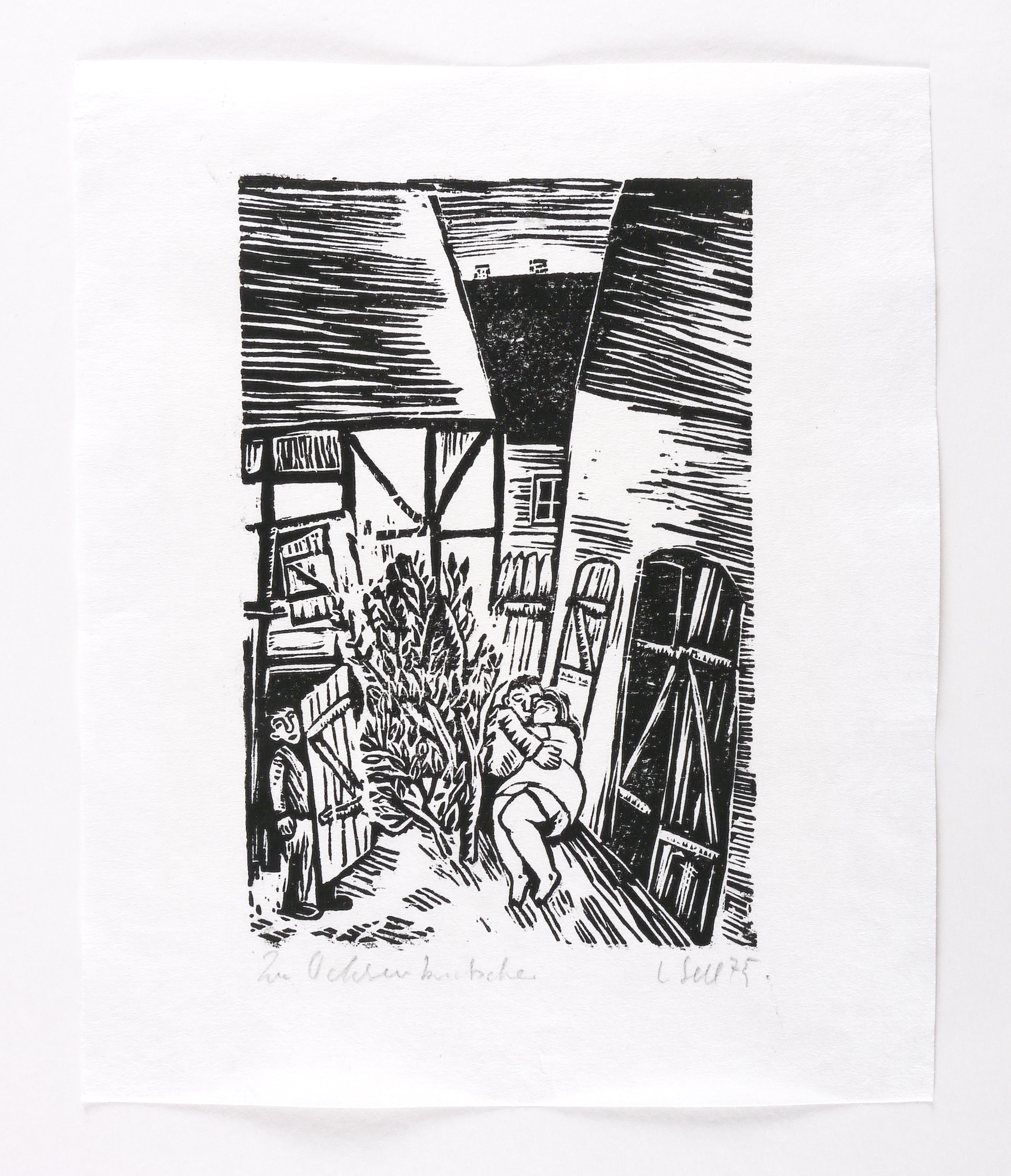 1975. Holzschnitt, in Schwarz, auf wolkigem weißlichem Similijapan. – Originale Künstlergrafik, von Lothar Sell. – 19,5 x 13,1 cm (Darstellung / Druckstock), 27 x 22 cm (Blatt).