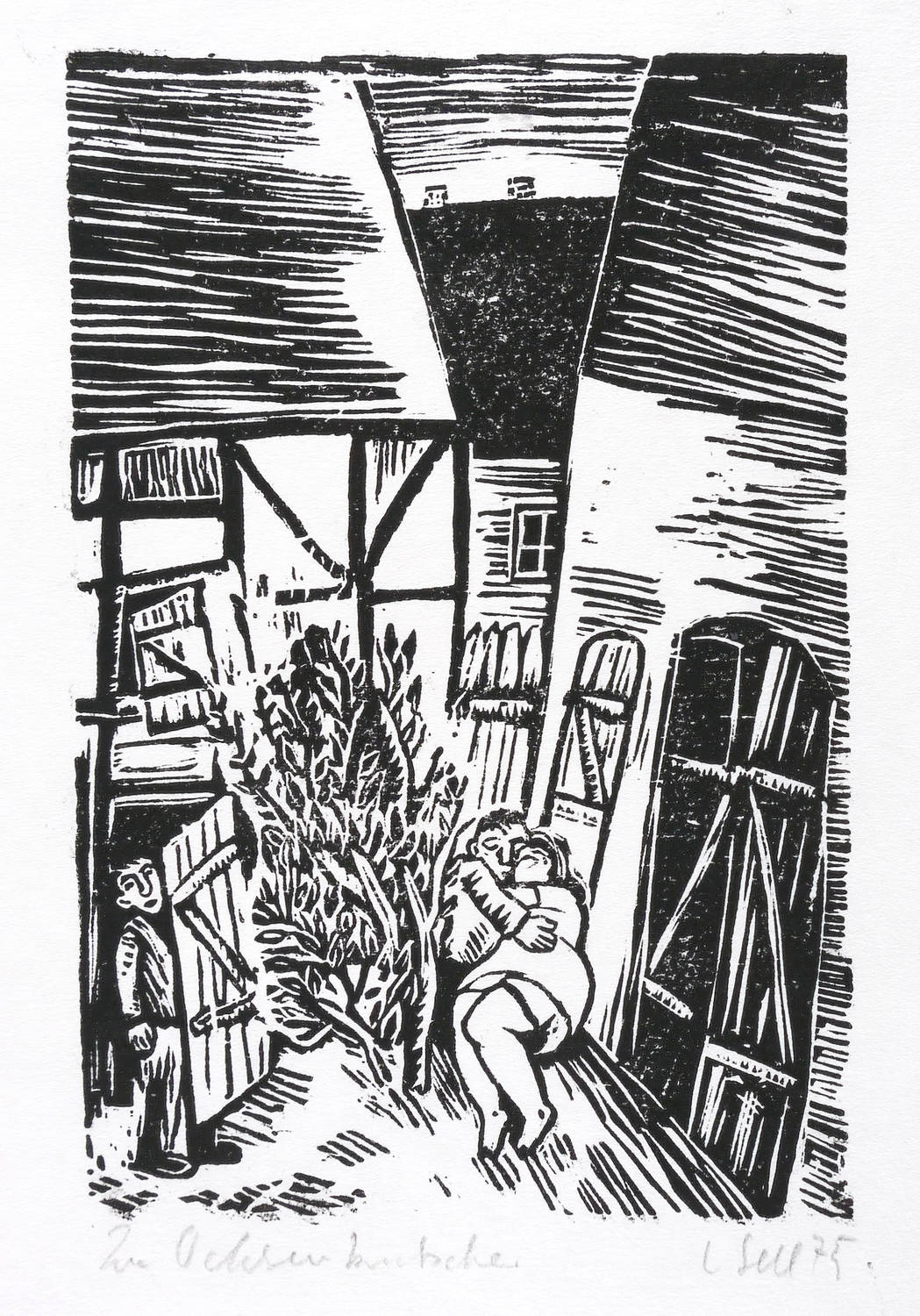 Links unten in Bleistift signiert und datiert: ″L Sell 75″. Links bezeichnet: ″Zu Ochsenkutscher″. – Die bei Lothar Sell beliebte Darstellung des Liebespaares im Bauernhof. – Sehr guter Zustand.