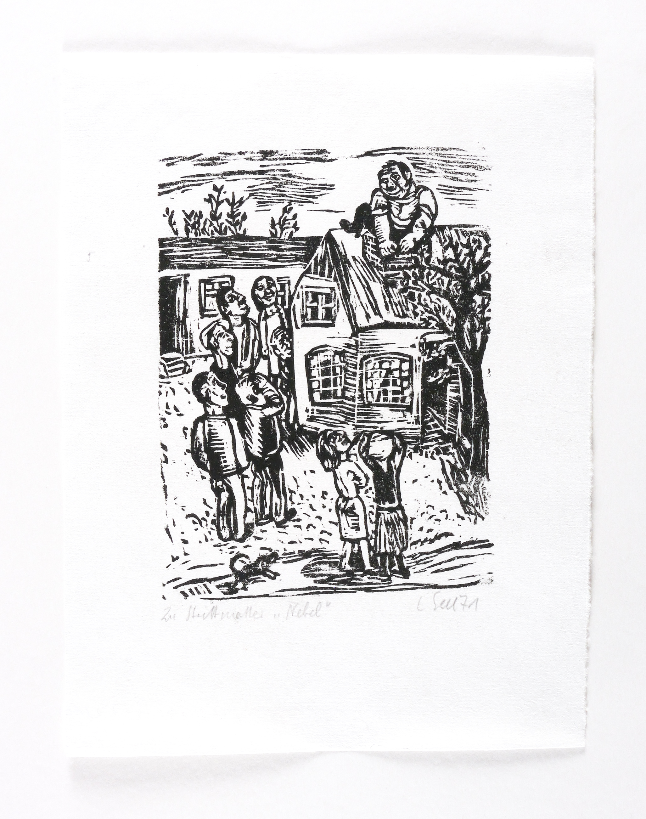 1971. Holzschnitt, in Schwarz, auf wolkigem weißlichem Similijapan. – Originale Künstlergrafik, von Lothar Sell. – 17,3 x 12,9 cm (Darstellung / Druckstock), 28 x 21 cm (Blatt).