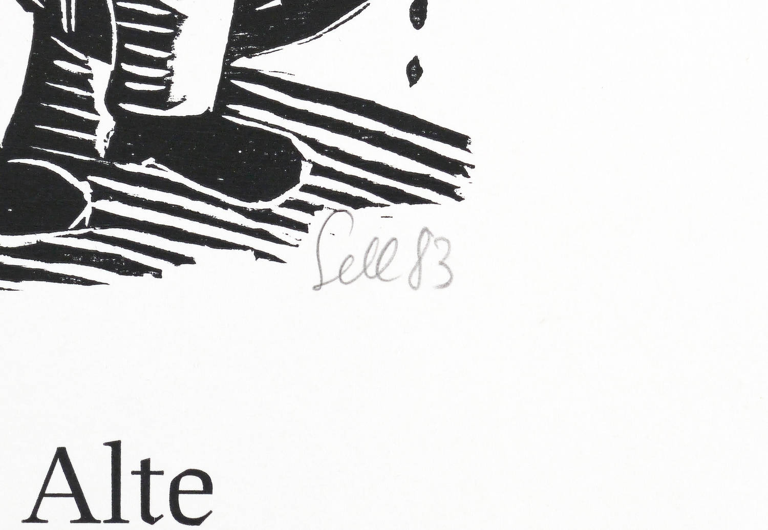 1983. Holzschnitt, in Schwarz, auf weißem Velinkarton. – Originale Künstlergrafik, von Lothar Sell. – 14,7 x 9,2 cm (Darstellung / ohne Schrift), 30 x 22 cm (Blatt), 22,1 x 9,2 cm (Darstellung / mit Schrift).