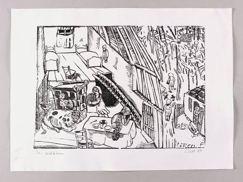 Rechts unten in Bleistift signiert und datiert: ″L Sell 69″. Links betitelt: ″Das Waldhaus″. – Sehr guter Zustand.