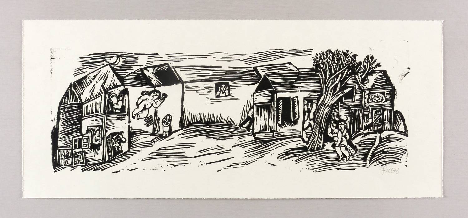 1973. Holzschnitt, in Schwarz, auf hellchamios Velin. – Originale Künstlergrafik, von Lothar Sell. – 14,5 x 41,6 cm (Darstellung / Druckstock), 21 x 49 cm (Blatt).