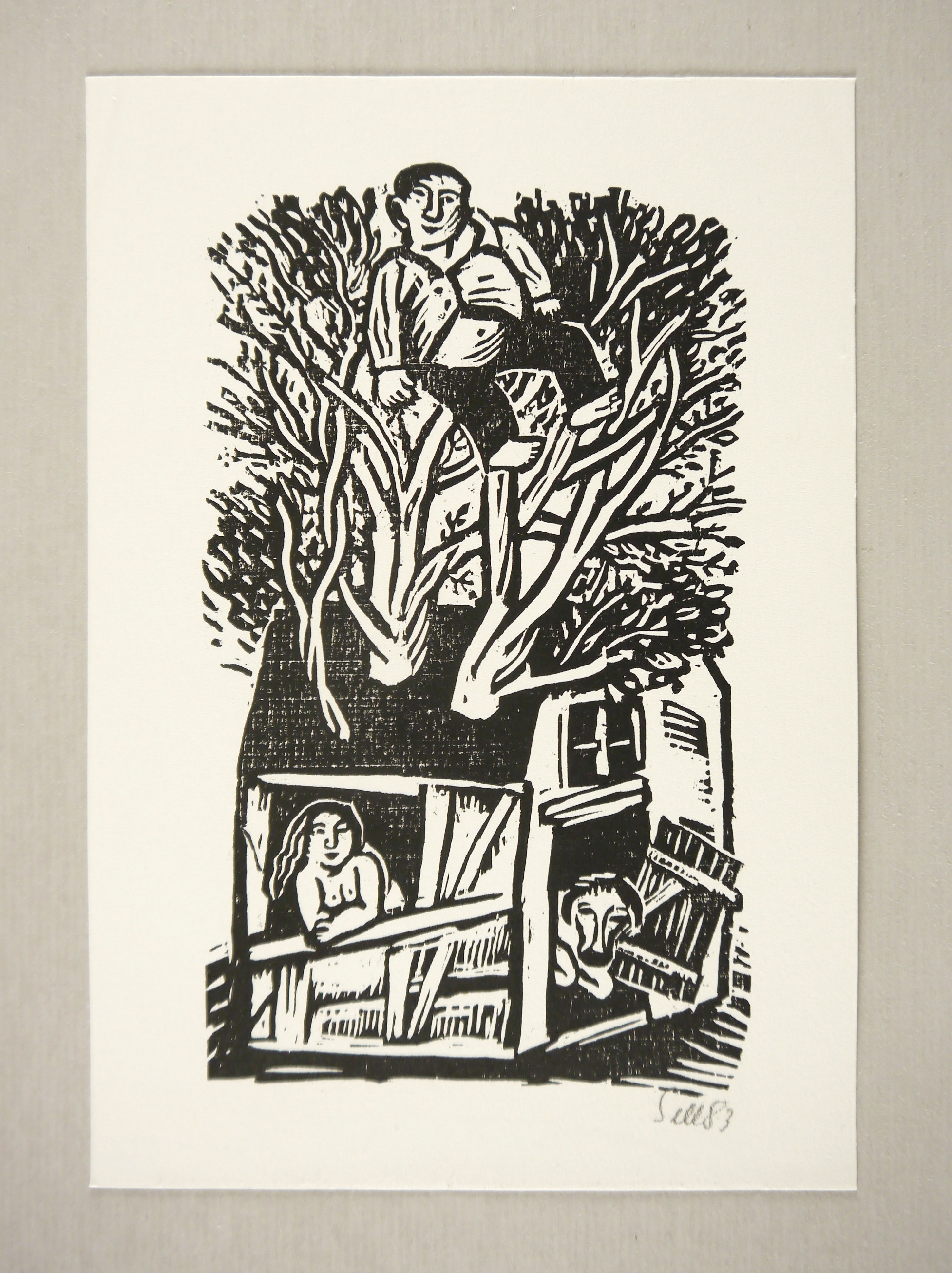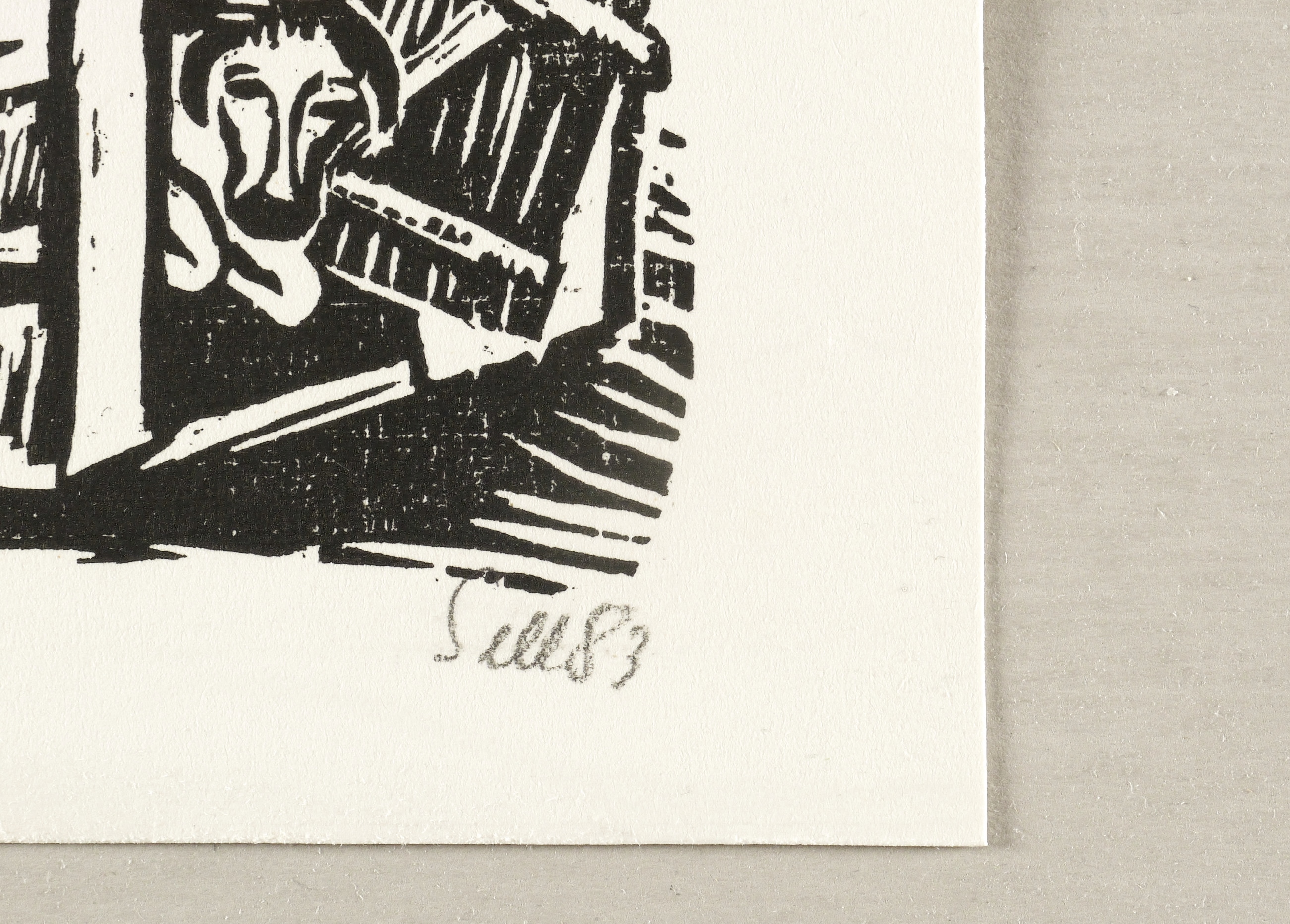 1983. Holzschnitt, in Schwarz, auf festem hellgelbem Velinkarton. – Originale Künstlergrafik, von Lothar Sell. – 17,9 x 10,5 cm (Darstellung / Druckstock), 22 x 15 cm (Blatt).