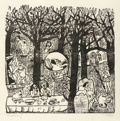 Lothar Sell (1939 Teuenbrietzen - 2009 Meißen). Deutscher Grafiker, Illustrator und Keramiker. 1957-63 Studium an der Hochschule für Bildende Künste Dresden (HfBK), bei Hans Theo Richter und Max Schwimmer. 1966-69 Meisterschüler an der Akademie der Künste Berlin (AdK). 1974-88 Lehrauftrag an der Burg Giebichenstein Hochschule für Kunst und Design in Halle. Mitglied im Verband Bildender Künstler der DDR. Seine Grafiken und Plastiken sind oft geprägt von einem humorigen "bäuerlichen" Charakter. Stilistisch dominiert deshalb eine oft derbe, zumeist auch naive Anmutung. 1976 Illustrationen zu Erwin Strittmatters "Ochsenkutscher". Die Leibesfülle, typisch für Sells Darstellung des menschlichen Körpers, charakterisiert u.a. die Keramiken des Brunnen im Meißner Zollhof.