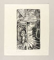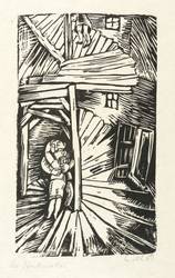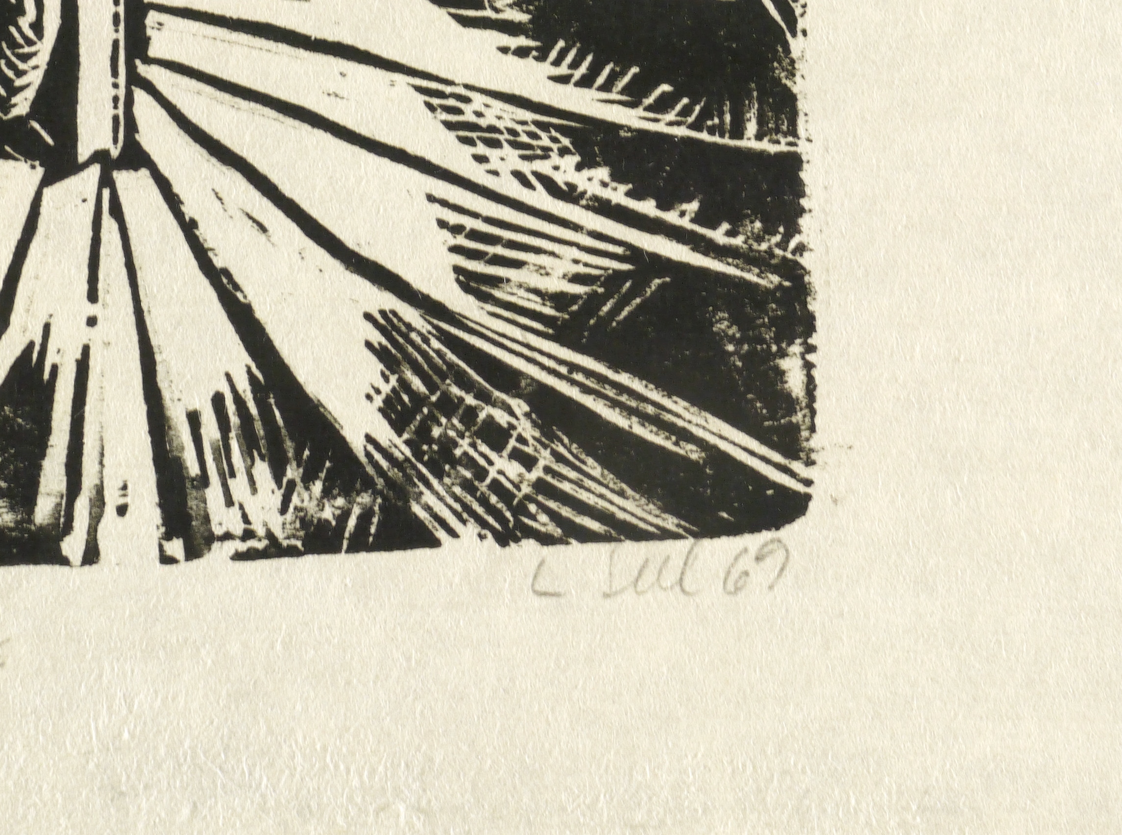 1969. Holzschnitt, in Schwarz, auf leichtem gelblichem Velin. – Originale Künstlergrafik, von Lothar Sell. – 19,8 x 11,4 cm (Darstellung / Druckbild), 25 x 22 cm (Blatt).