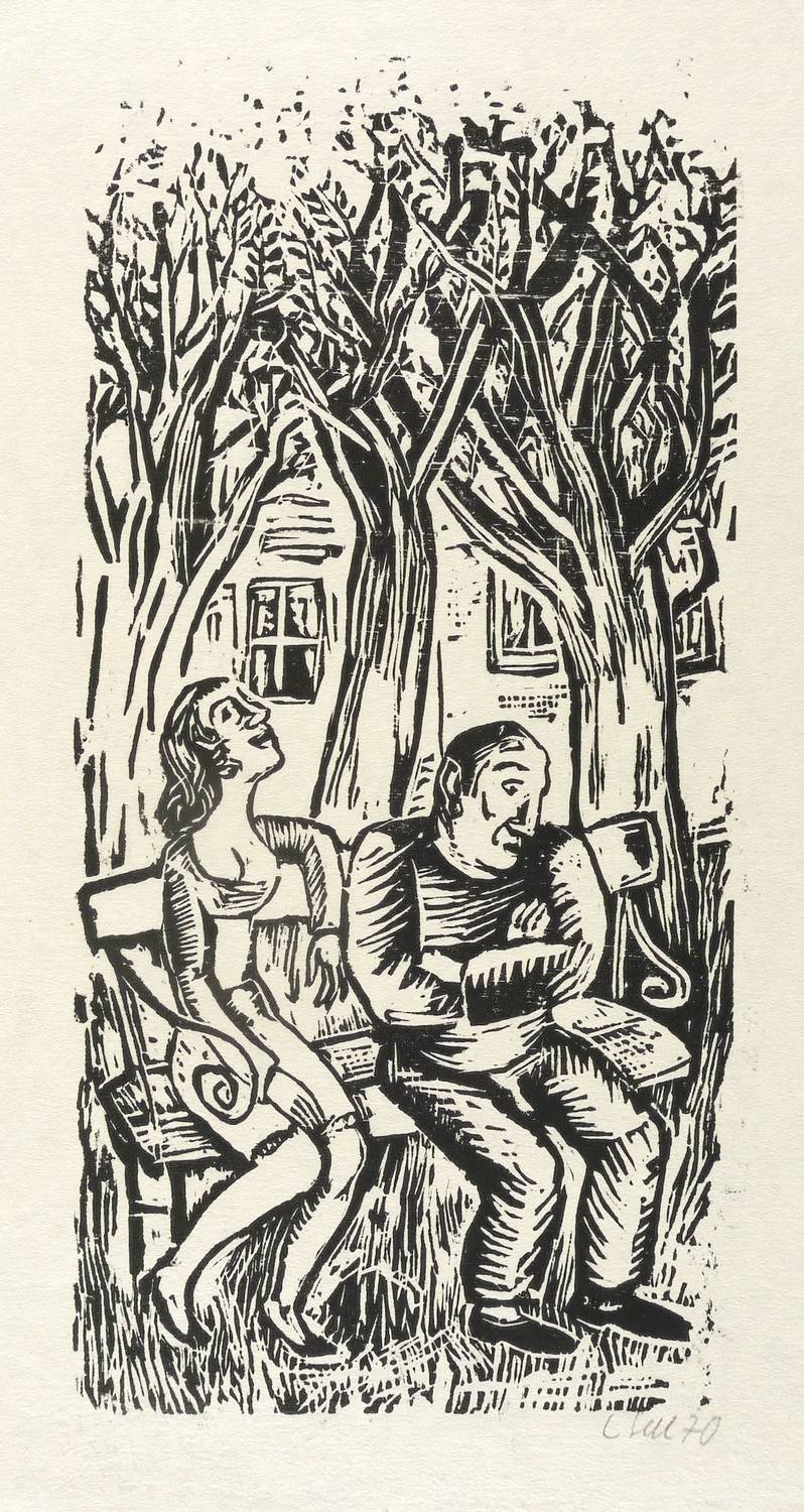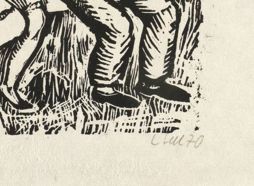 1970. Holzschnitt, in Schwarz, auf leichtem gelblichem Velin. – Originale Künstlergrafik, von Lothar Sell. – 23,2 x 11,2 cm (Darstellung / Druckbild), 29 x 23 cm (Blatt).