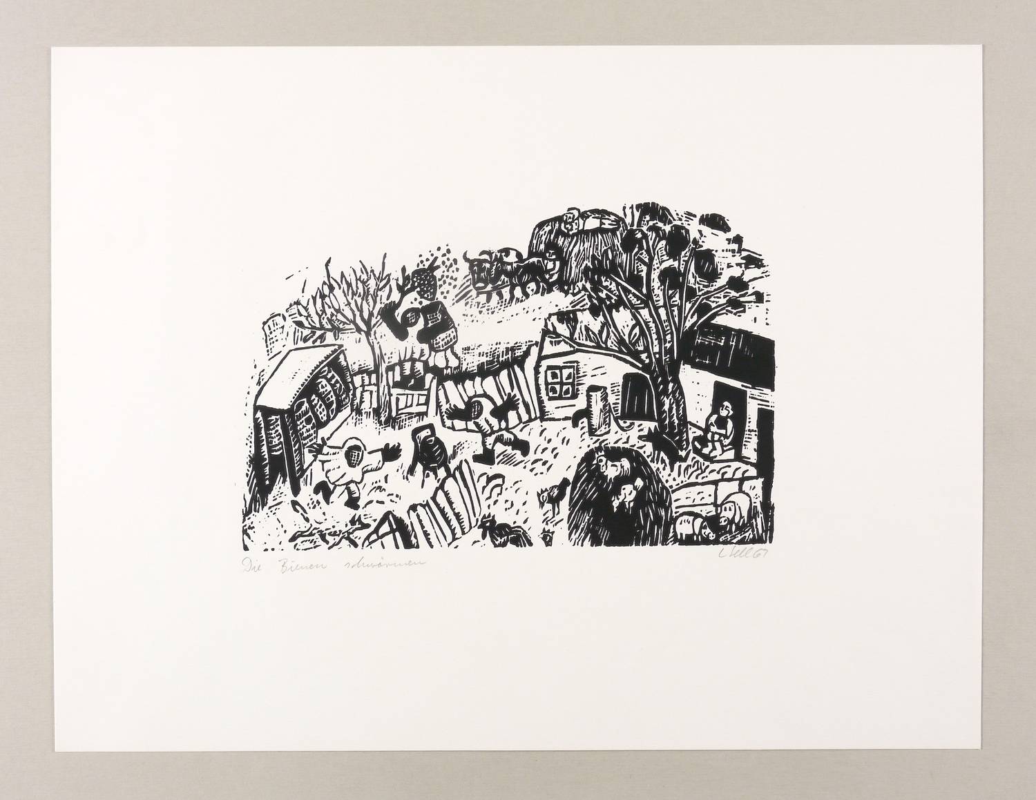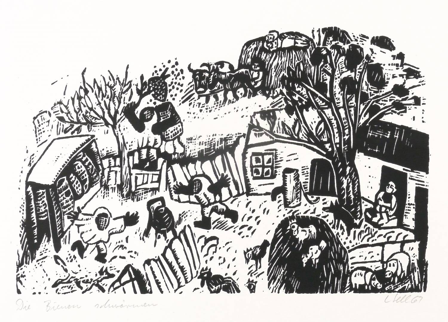 Rechts unten in Bleistift signiert und datiert: ″L. Sell 69″. Links Titel: ″Die Bienen schwärmen″. – Sehr guter Zustand.