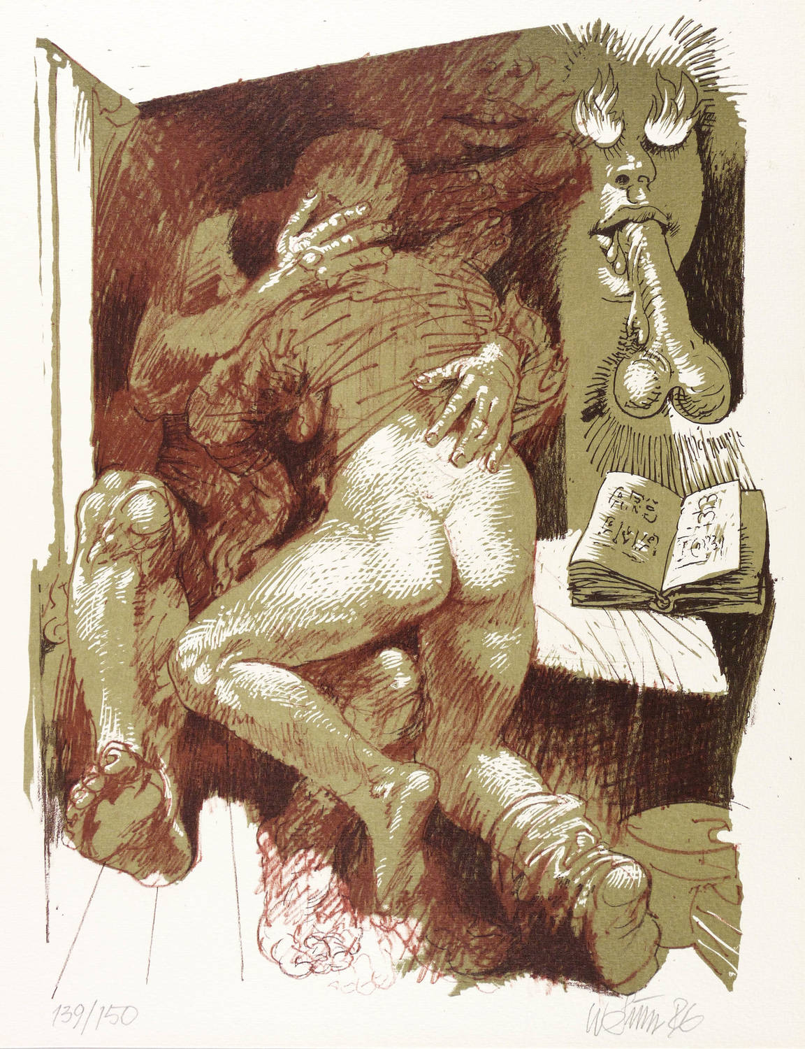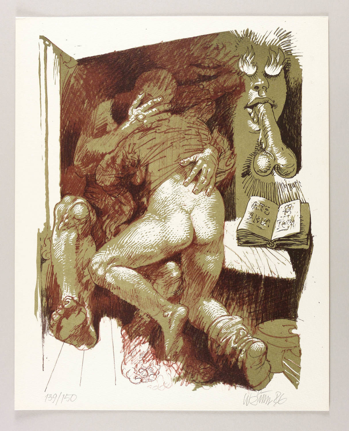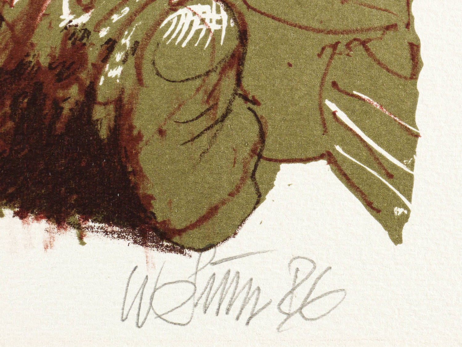 1986. Farblithografie / Kreidelithografie, in Olivgrün, Rot- & Schwarzbraun, auf Weißenborn-Bütten. – Originale Künstlergrafik, von Willi Sitte. – Auflage Exemplar Nr. 139/150. – 46,3 x 35,5 cm (Darstellung / Druckbild), 50 x 40 cm (Blatt).