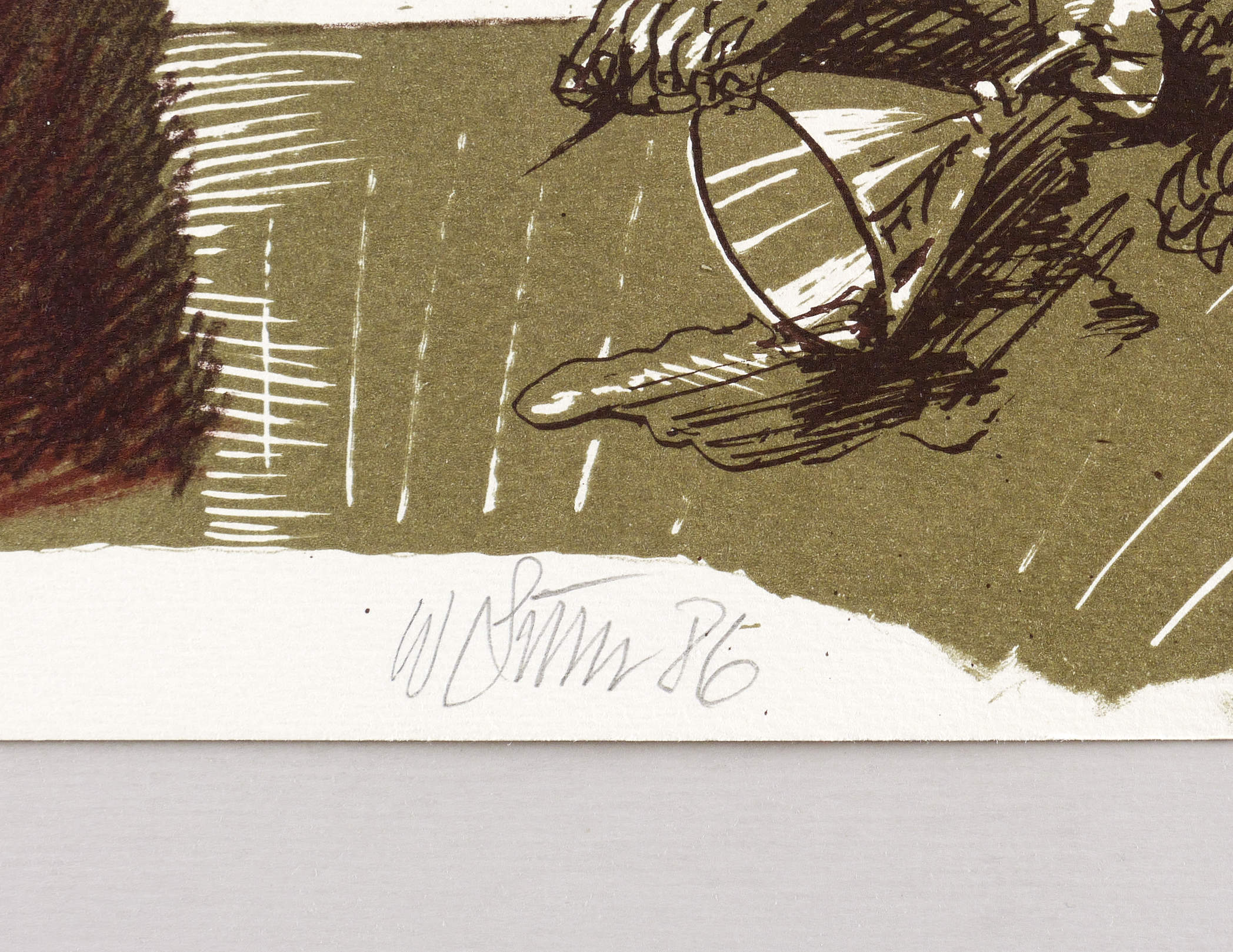 1986. Farblithografie / Kreidelithografie, in Olivgrün, Rot- & Dunkelbraun, auf Weißenborn-Bütten. – Originale Künstlergrafik, von Willi Sitte. – Auflage Exemplar Nr. 89/150. – 49,4 x 38,2 cm (Darstellung / Druckbild), 50 x 40 cm (Blatt).