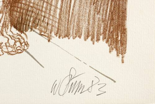 Aus: Willi Sitte, O Liebe, wie machst du der Freuden so viel! Sechs Lithografien zum Hochzeitsscherz von Johann Christian Günther. Grafik-Edition XVII (Leipzig: Reclam 1984). – Rechts unten in Bleistift signiert und datiert: ″W. Sitte 83″. Links eigenhändige Auflagenbezeichnung. – Sehr guter Zustand.