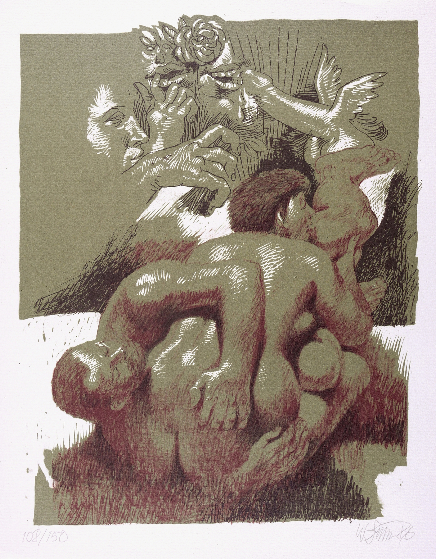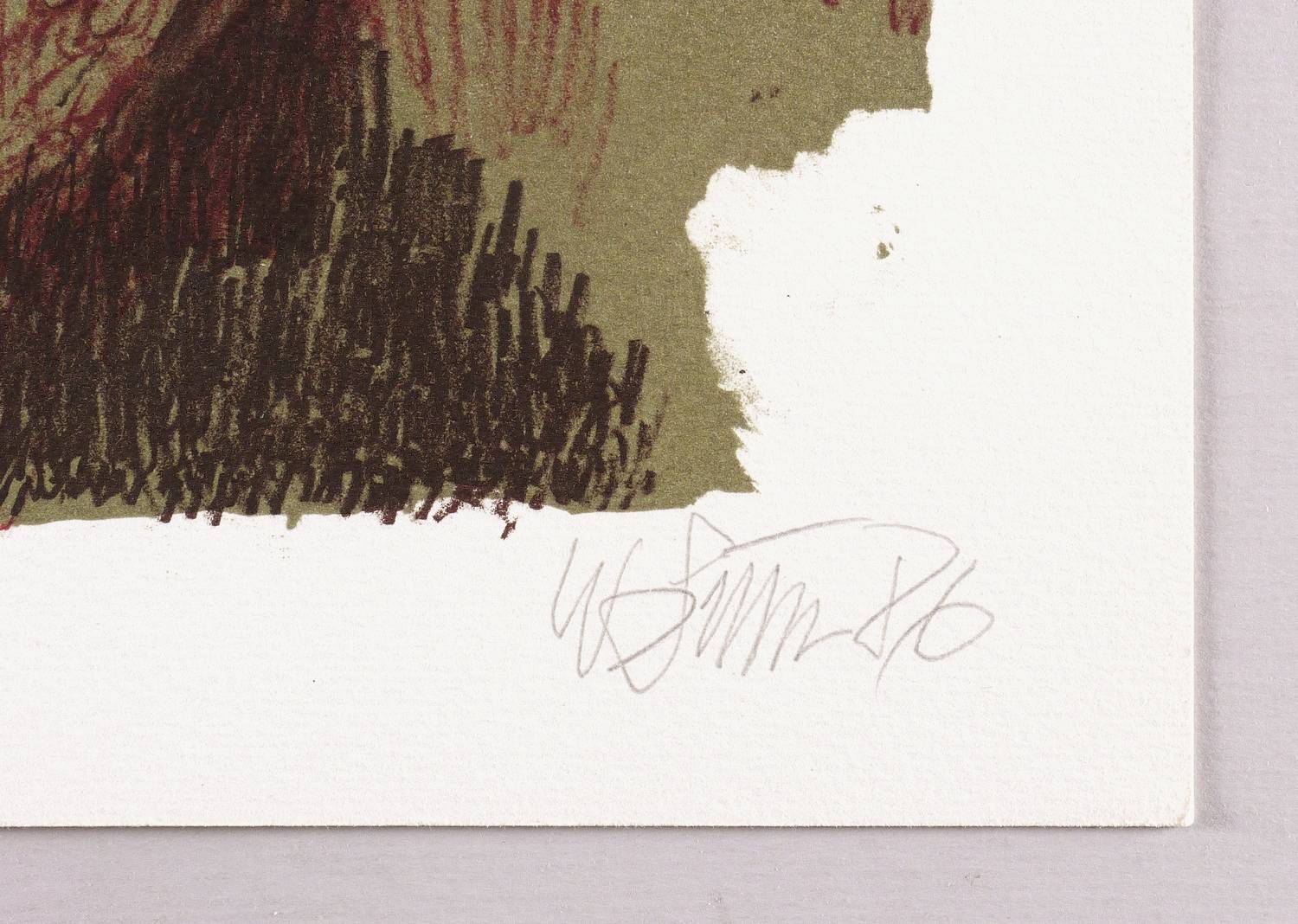 1986. Farblithografie / Kreidelithografie, in Olivgrün, Rot- & Dunkelbraun, auf hellchamois Weißenborn. – Originale Künstlergrafik, von Willi Sitte. – Auflage Exemplar Nr. 108/150. – 44,9 x 35,6 cm (Darstellung / Druckbild), 50 x 40 cm (Blatt).