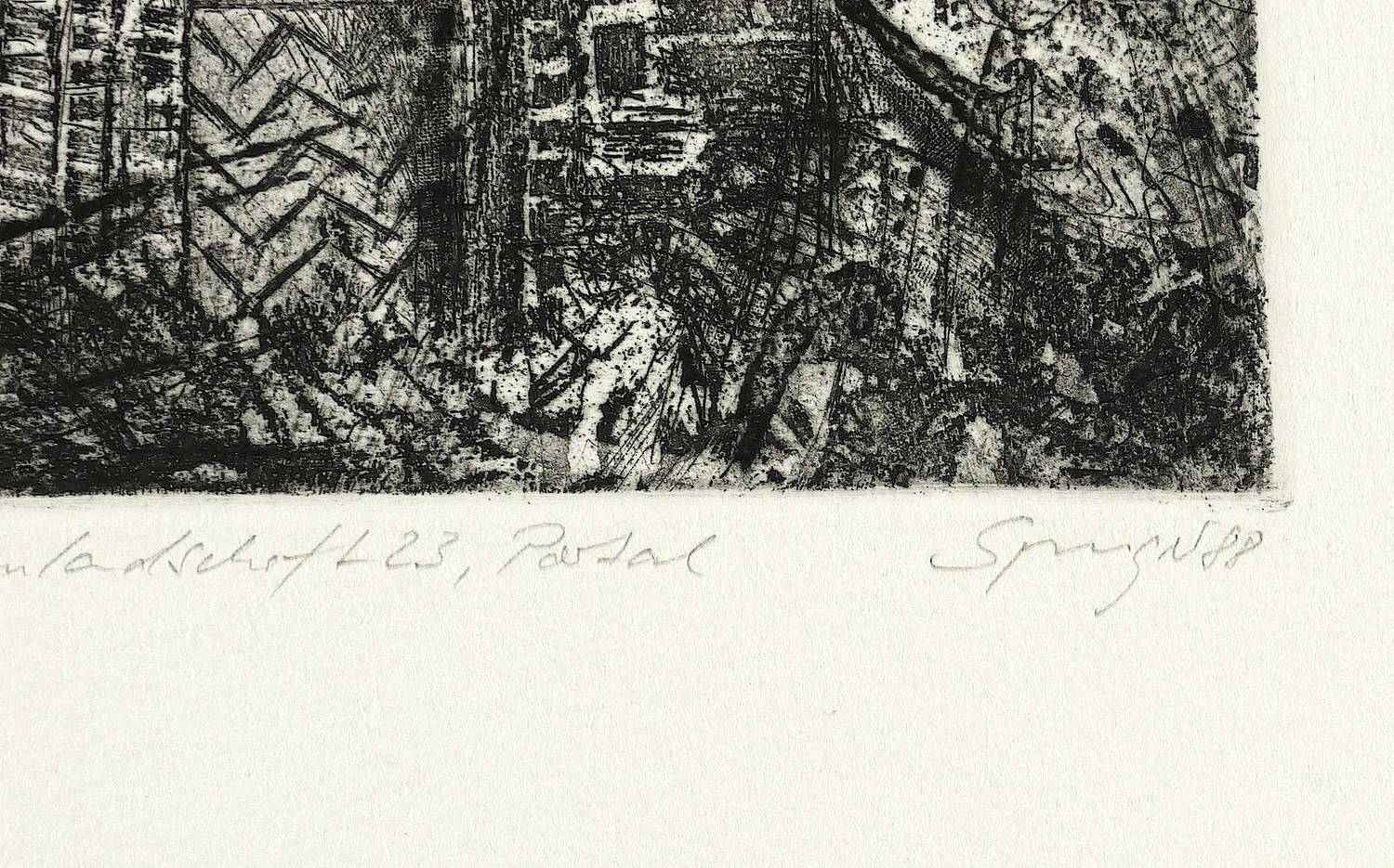 1988. Radierung / Strichätzung, Vernis mou, Roulette & Reservage, in Schwarz, auf Hahnemühle-Bütten. – Originale Künstlergrafik, von Reinhard Springer. – Künstlerexemplar (e.a.). – 10,2 x 12,8 cm (Darstellung / Platte), 39,3 x 26,7 cm (Blatt).