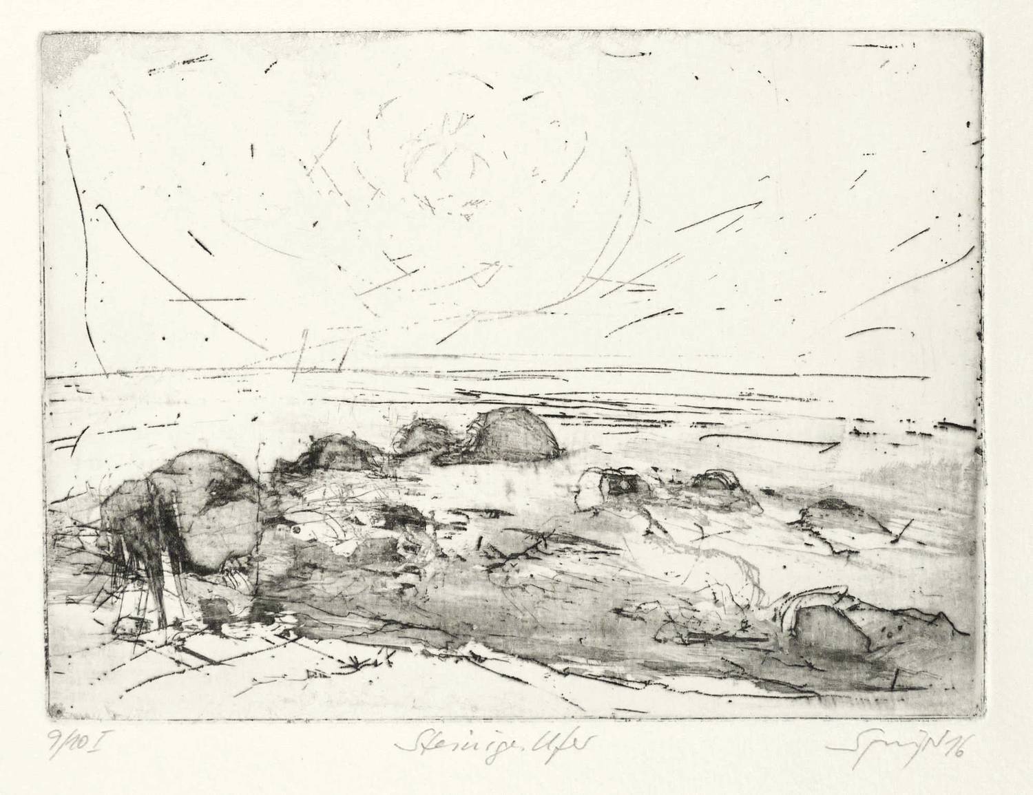 2016. Radierung / Strichätzung, Aquatinta & Kaltnadel, in Schwarz, auf Büttenpapier. – Originale Künstlergrafik, von Reinhard Springer. – Auflage Exemplar Nr. 9/10 I. – 9,8 x 12,4 cm (Darstellung / Platte), 39,2 x 26,2 cm (Blatt).