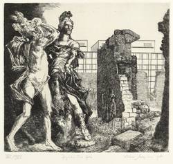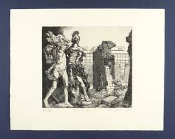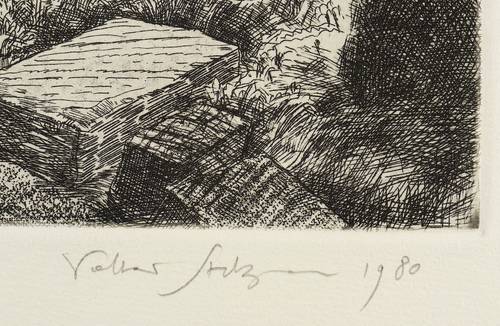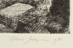 1980. Radierung / Strichätzung, in Schwarz, mit Plattenton, auf hellchamois Hahnemühle. – Originale Künstlergrafik, von Volker Stelzmann. – Auflage Exemplar Nr. 11/25. – 26,5 x 29,1 cm (Darstellung / Platte), 39 x 50 cm (Blatt).