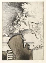 1972. Radierung / Strichätzung & Aquatinta, in Schwarz, auf hartem hellgelbem Papier. – Originale Künstlergrafik, von Volker Stelzmann. – 21,7 x 15,3 cm (Darstellung / Platte), 32 x 24 cm (Blatt).