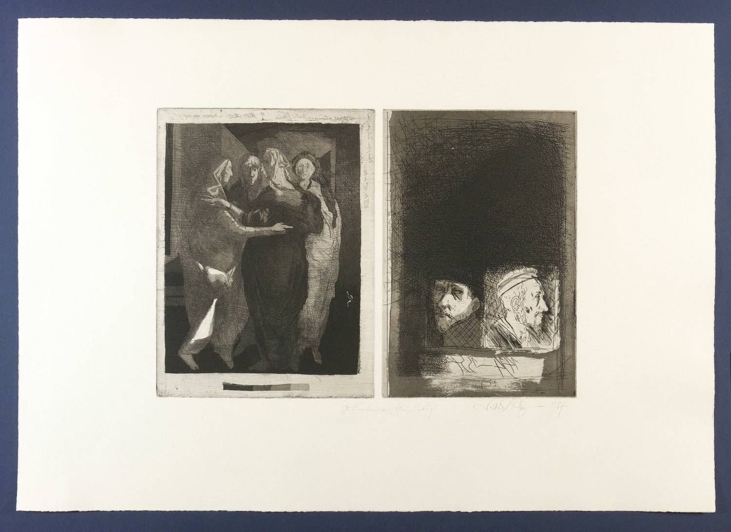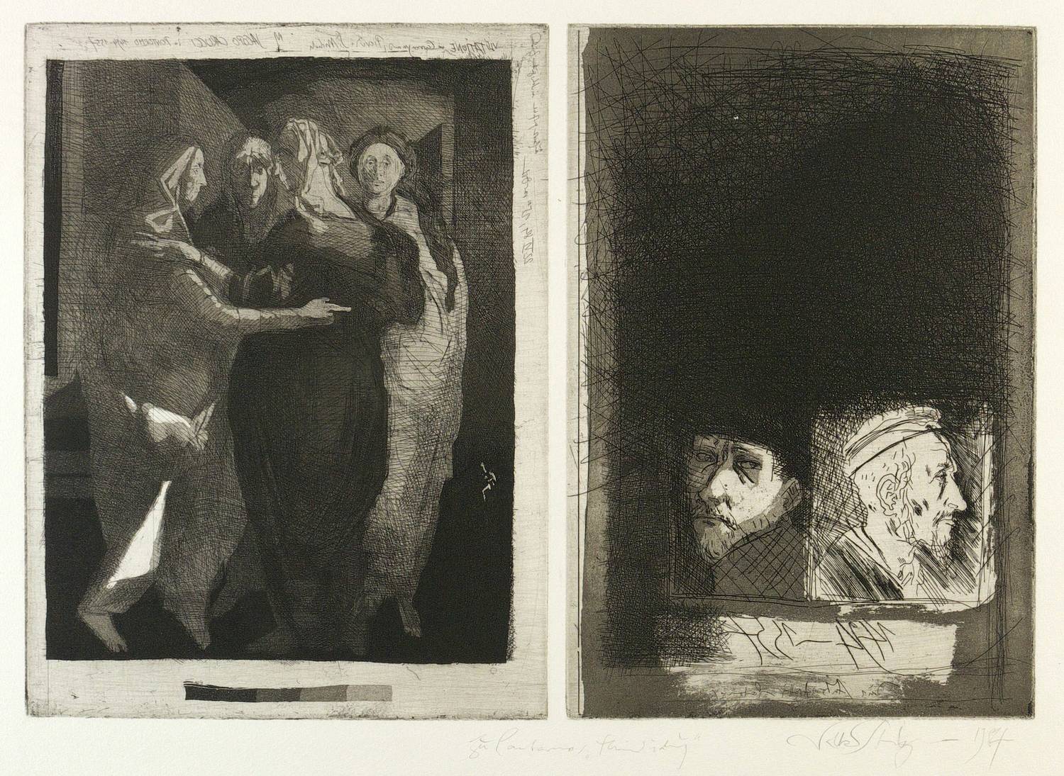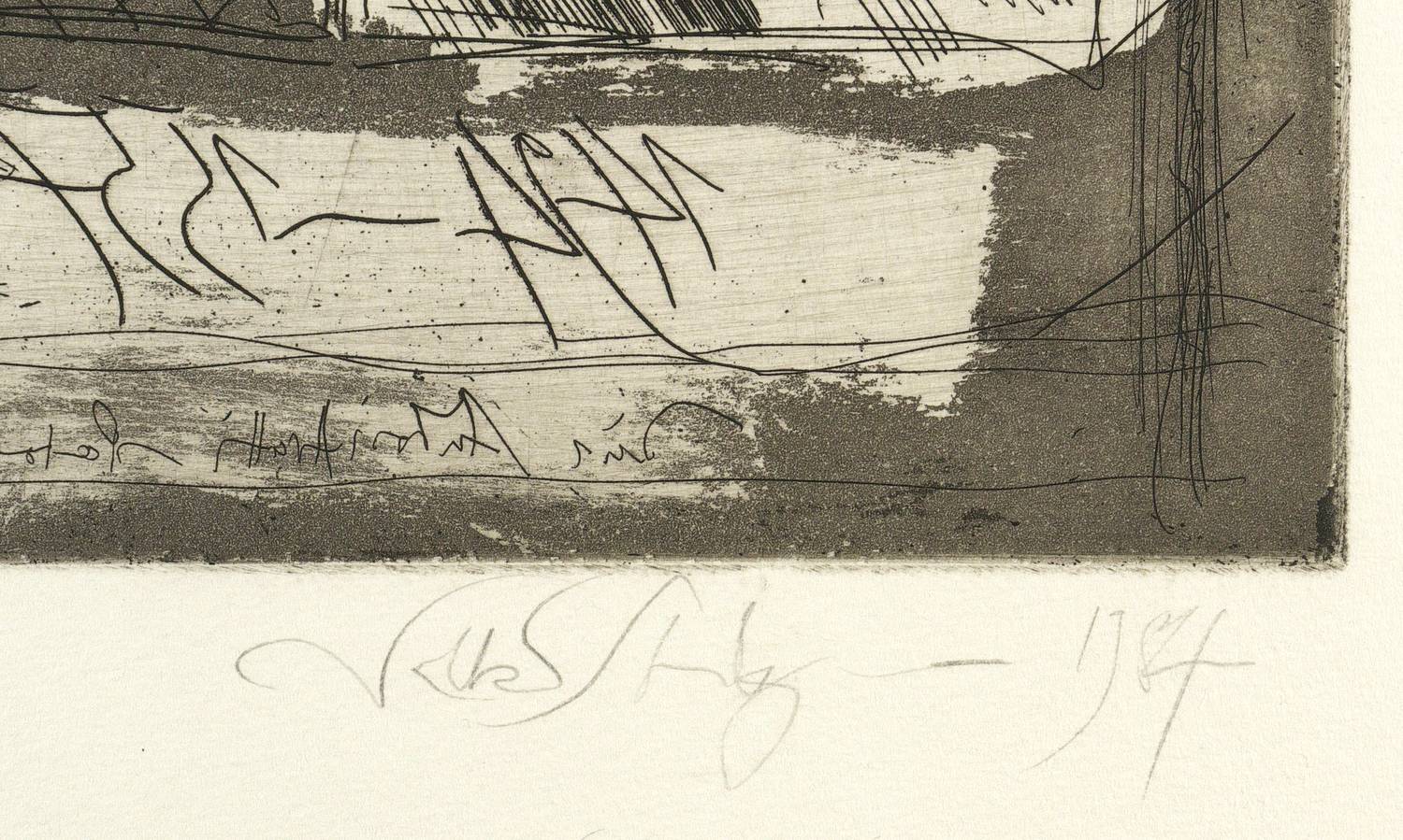 1984. Radierung / Strichätzung, mit Plattenton, auf Büttenpapier. – Originale Künstlergrafik, von Volker Stelzmann. – 34,7 x 50,5 cm (Darstellung / Platte), 59 x 83 cm (Blatt).
