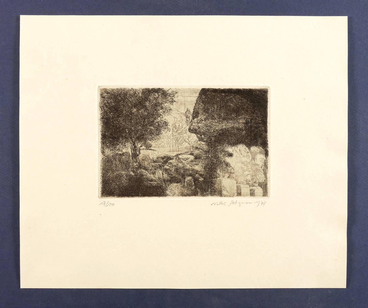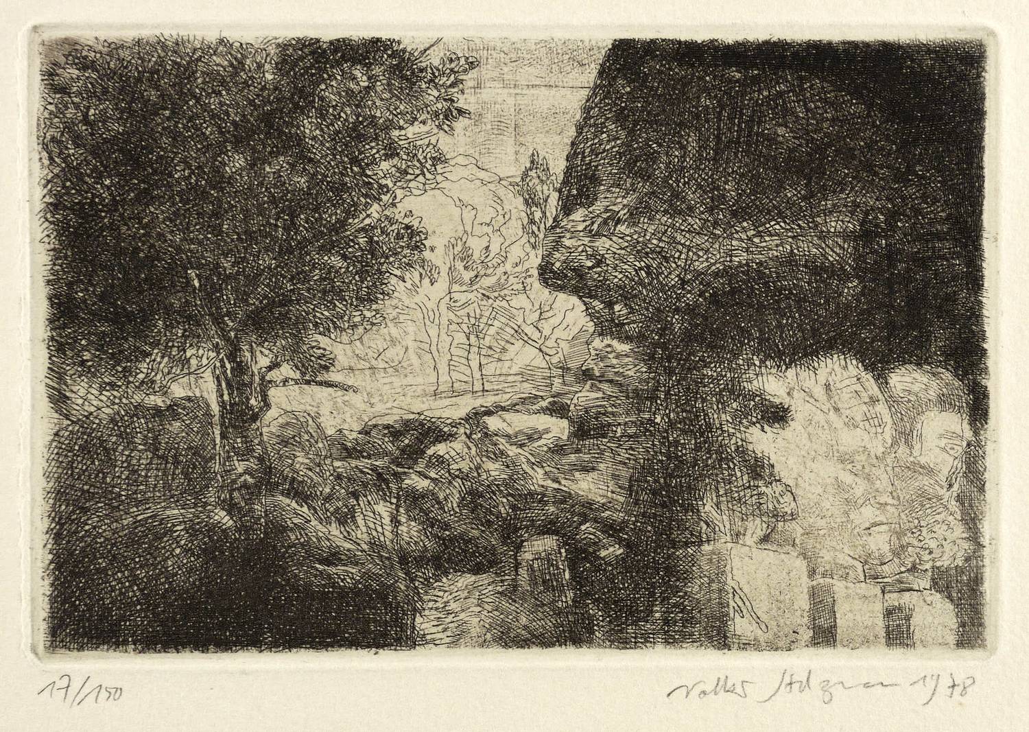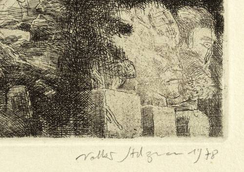 1978. Radierung / Strichätzung, in Schwarzbraun, auf hartem gelblichem Maschinenbütten. – Originale Künstlergrafik, von Volker Stelzmann. – 12,4 x 18,8 cm (Darstellung / Platte), 30 x 35,5 cm (Blatt).