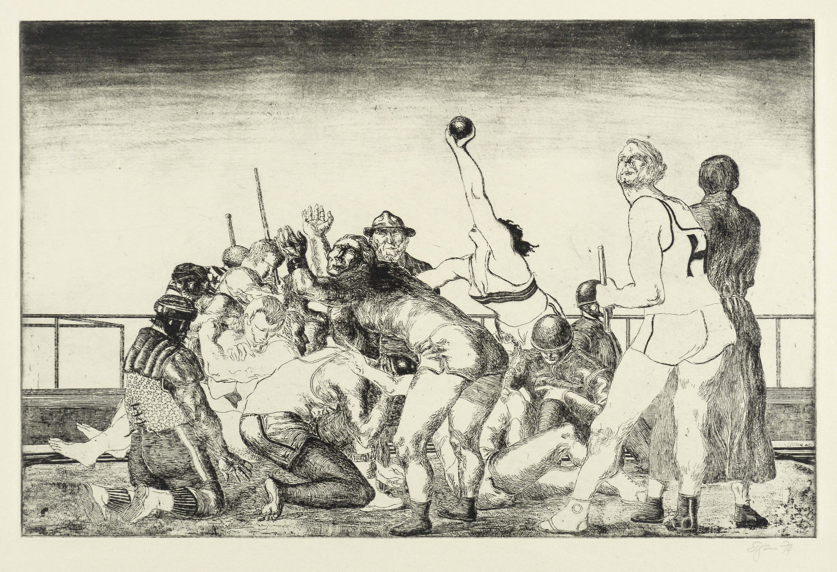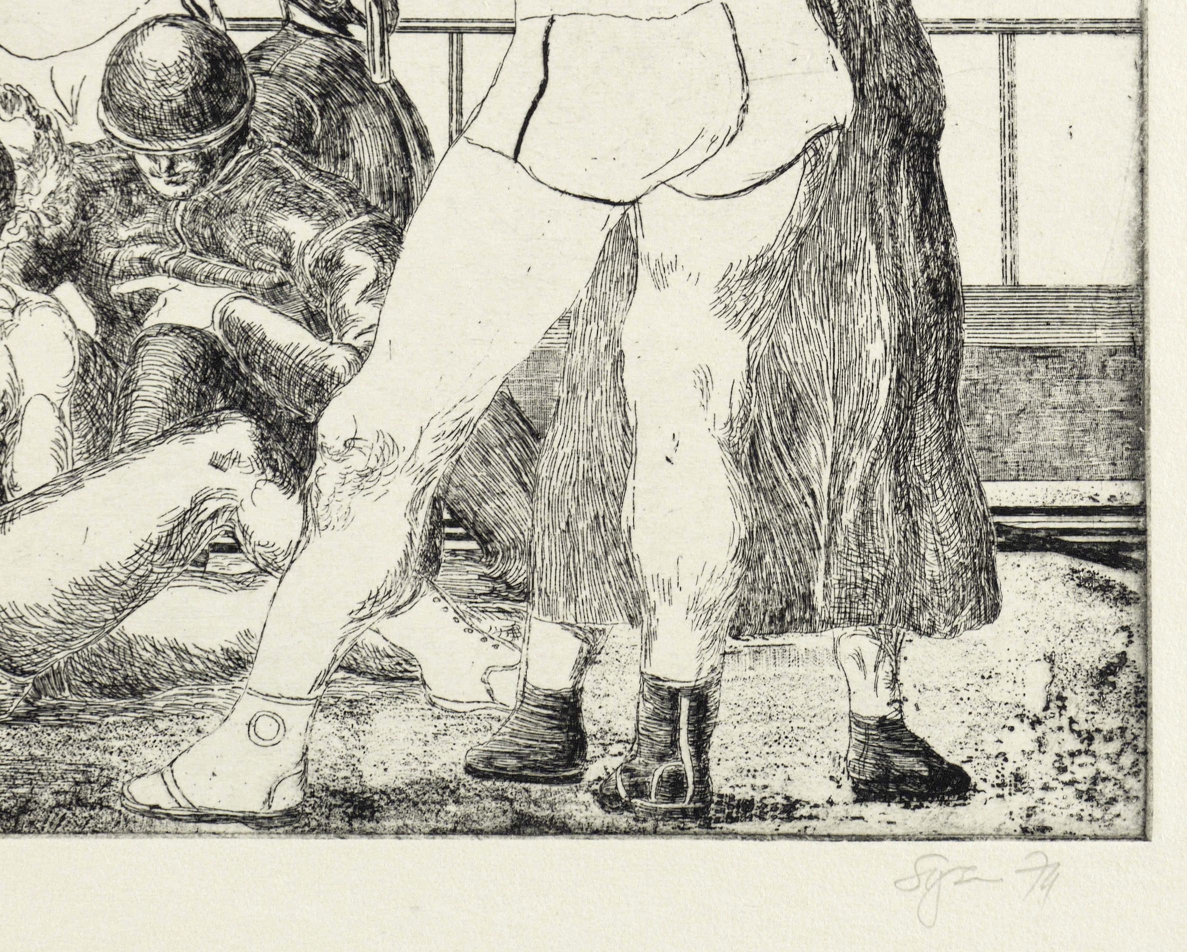 1973/1974. Radierung / Strichätzung & Roulette, in Schwarz, auf gelblichem Velin. – Von Volker Stelzmann. – 22,2 x 33,6 cm (Darstellung / Platte), 30 x 42 cm (Blatt).