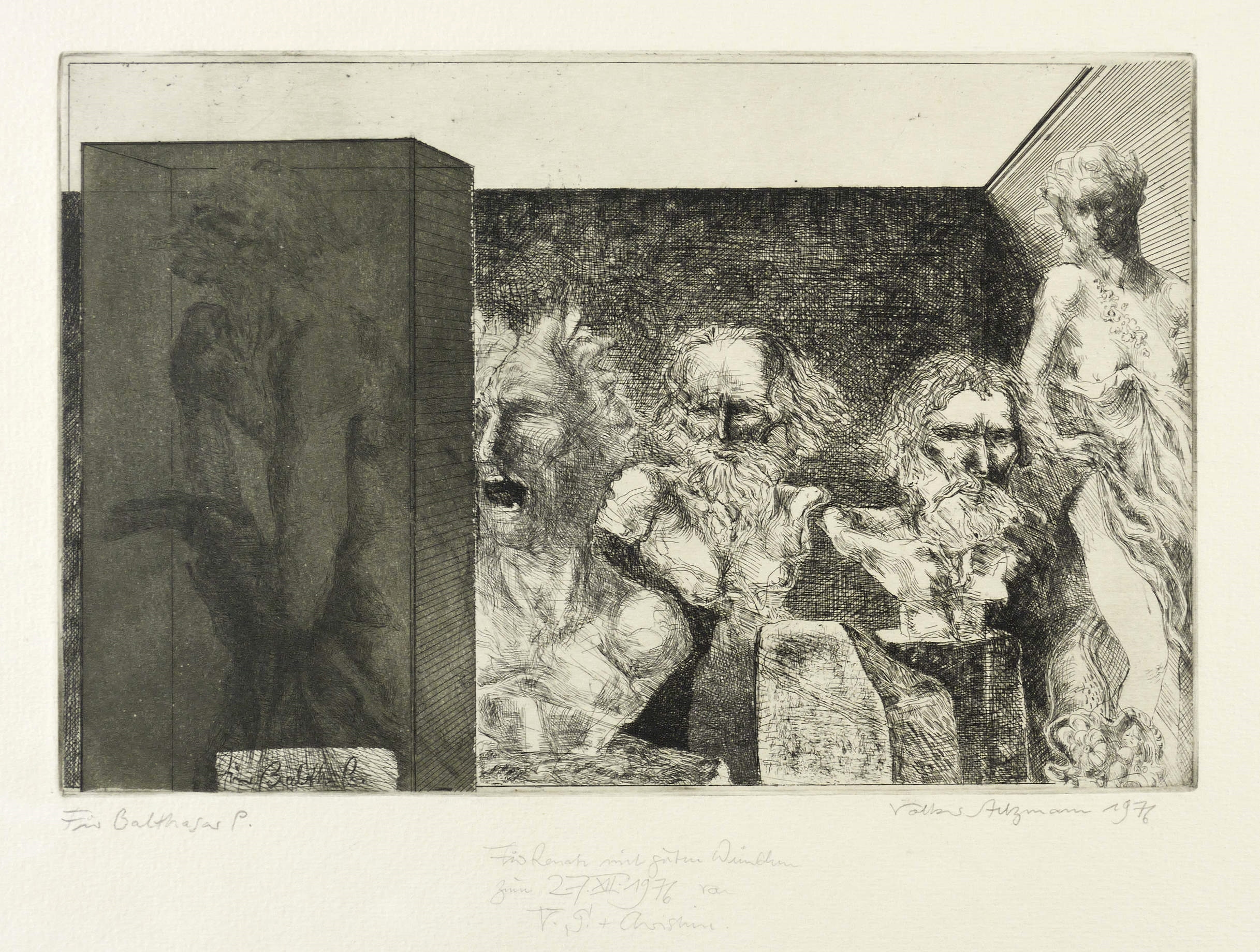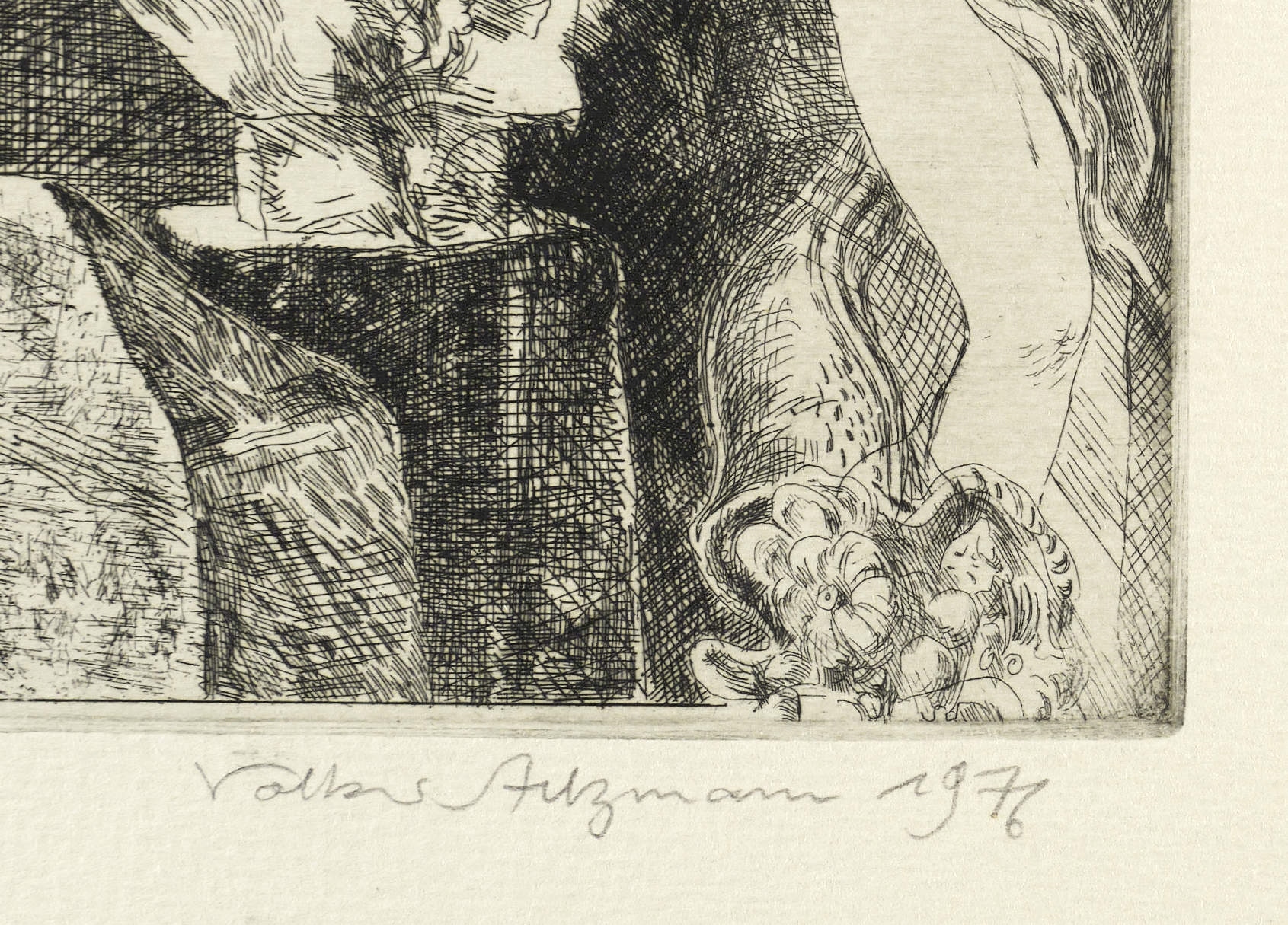 Behrends-Musinowski 77. – Rechts unten in Bleistift signiert und datiert: ″Volker Stelzmann 1976″. Links eigenhändiger Titel. Mittig darunter persönliche Widmung des Künstlers. In der Platte links unten Inschrift: ″für Balthaßar″. – Ohne Mängel. Sehr guter Zustand.
