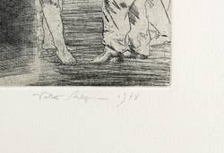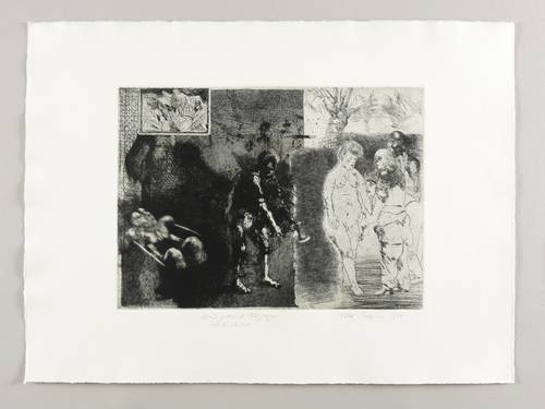 1978. Radierung / Strichätzung & Aquatinta, partiell geschabt, in Schwarz, auf schwerem chamois Velin. – Originale Künstlergrafik, von Volker Stelzmann. – Druckerexemplar. – 24,3 x 33,3 cm (Darstellung / Platte), 40 x 54 cm (Blatt).