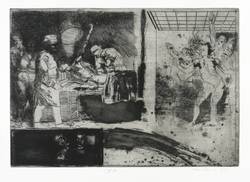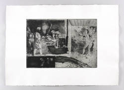 1981. Radierung / Strichätzung & Aquatinta, partiell geschliffen, mit Plattenton, in Schwarz, auf chamois Hahnemühle. – Originale Künstlergrafik, von Volker Stelzmann. – 34,3 x 49,7 cm (Darstellung / Platte), 57 x 79 cm (Blatt).