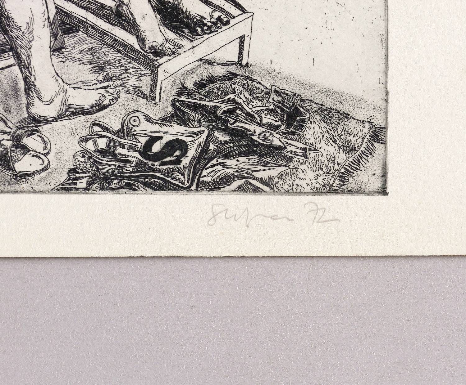 1972. Radierung / Strichätzung & Roulette, in Schwarz, auf hartem hellchamois Weißenborn. – Originale Künstlergrafik, von Volker Stelzmann. – 21,9 x 24,7 cm (Darstellung / Platte), 25 x 38 cm (Blatt).