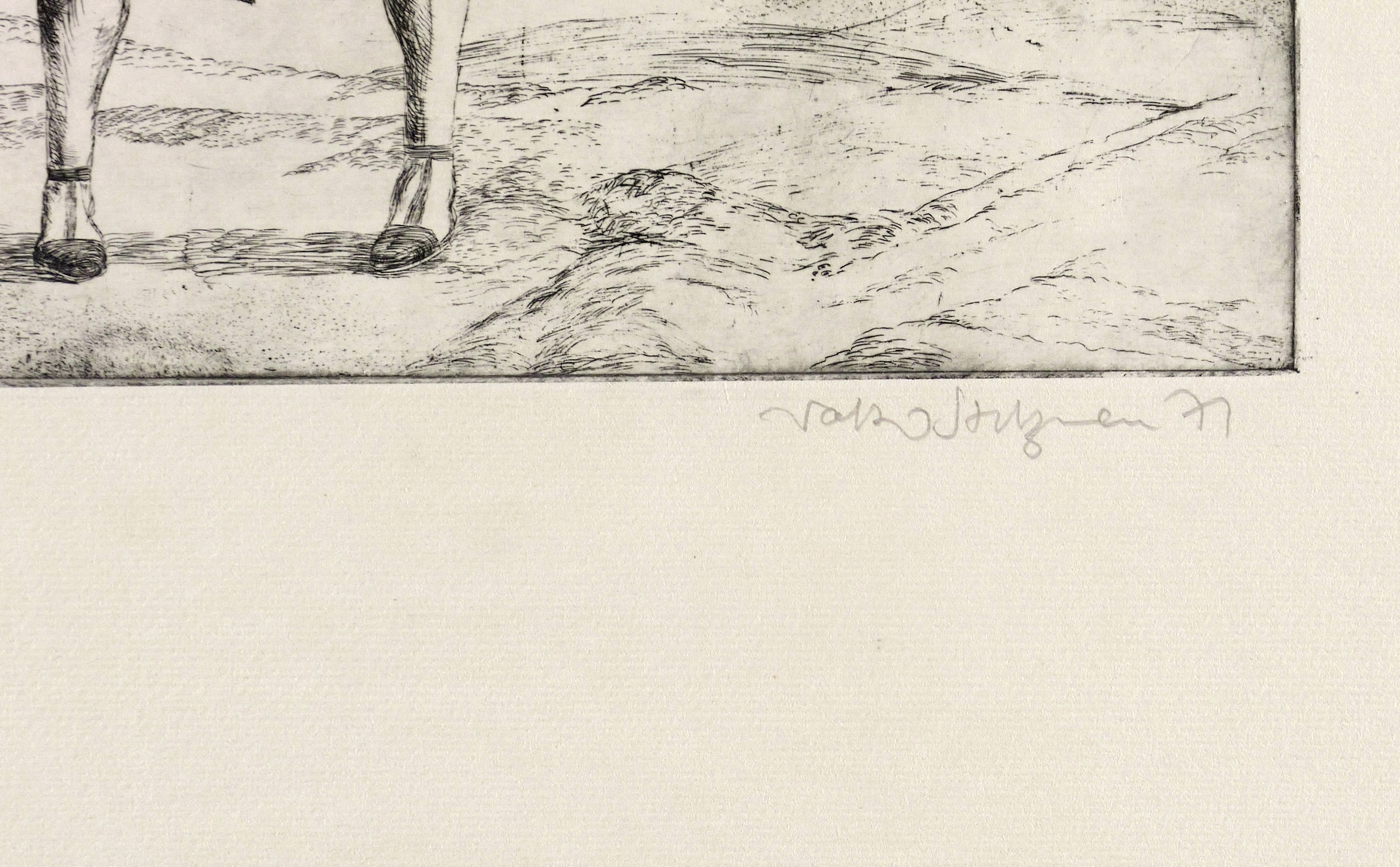 1972. Radierung / Strichätzung, in Schwarz, auf hartem hellgelbem Velin. – Originale Künstlergrafik, von Volker Stelzmann. – Künstlerexemplar (e.a.). – 21,1 x 24,7 cm (Darstellung / Platte), 49 x 38 cm (Blatt).