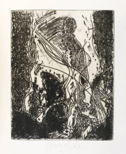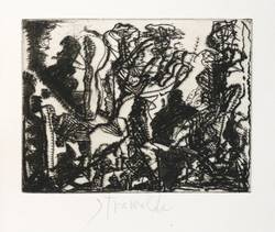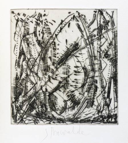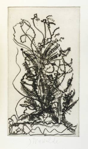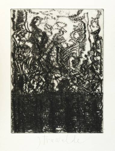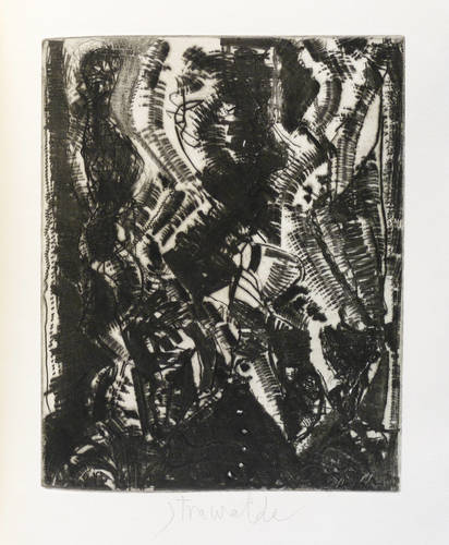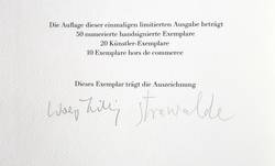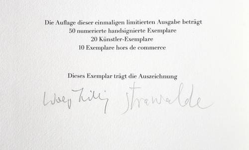 Jede Radierung unterhalb in Bleistift signiert: ″Strawalde″. Im Impressum in Bleistift von Wolfgang Hilbig und Strawalde signiert. – Sechs originalgrafische Radierungen von Strawalde zu ″Unsicheres Ufer″ von Wolfgang HIlbig (Berlin: Edition Maldoror 2003). Das Künstlerbuch wurde in einer limitierten Auflage von 50 Exemplaren herausgegeben, hinzu kommen 20 Künstlerexemplare. – Rücken unten leicht bestoßen. Guter Zustand.