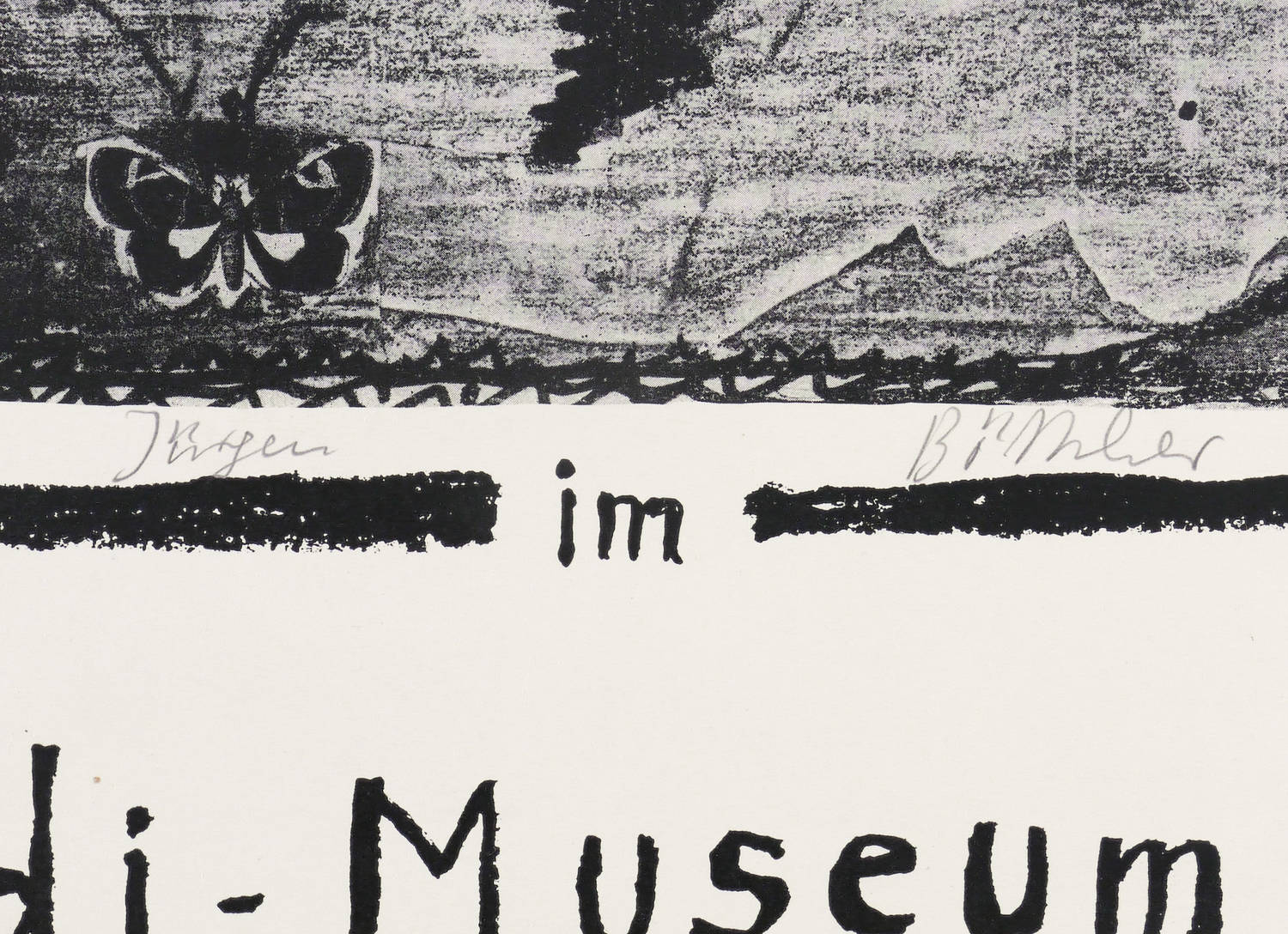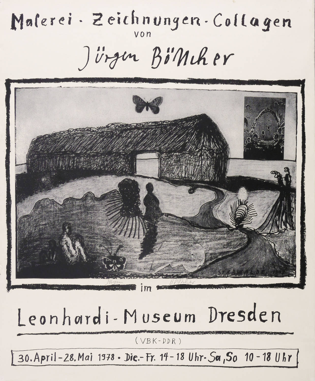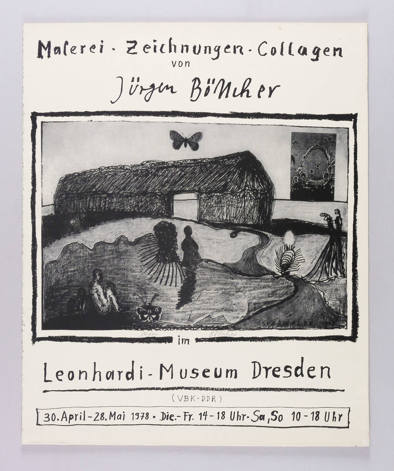 Unterhalb der Darstellung in Bleistift signiert: ″Jürgen Böttcher″. In der Darstellung rechts unten gedruckte Signatur mit Jahr: ″STRAWALDE 1978″. Dazu Plakat-Inschrift. – Originalgrafisches Künstlerplakat zur Ausstellung ″Malerei, Zeichnungen, Collagen von Jürgen Böttcher″ im Leonhardi-Museum in Dresden 30.4.-28.5.1978. – Provenienz: Sammlung Gerlint Söder und Erhard Frommhold, Dresden. – Links kleiner reparierter Randriss (8 mm). Sonst guter Zustand.