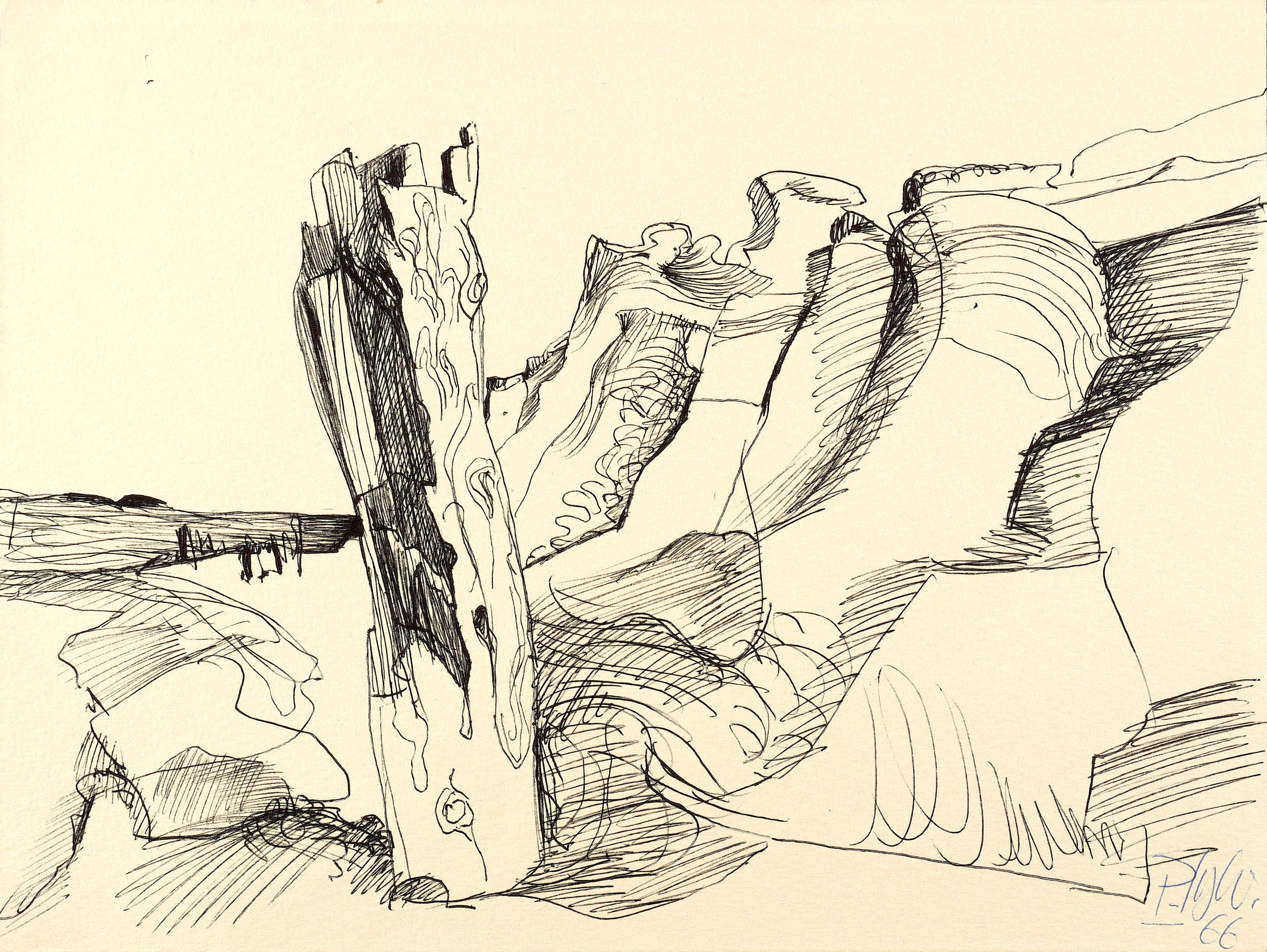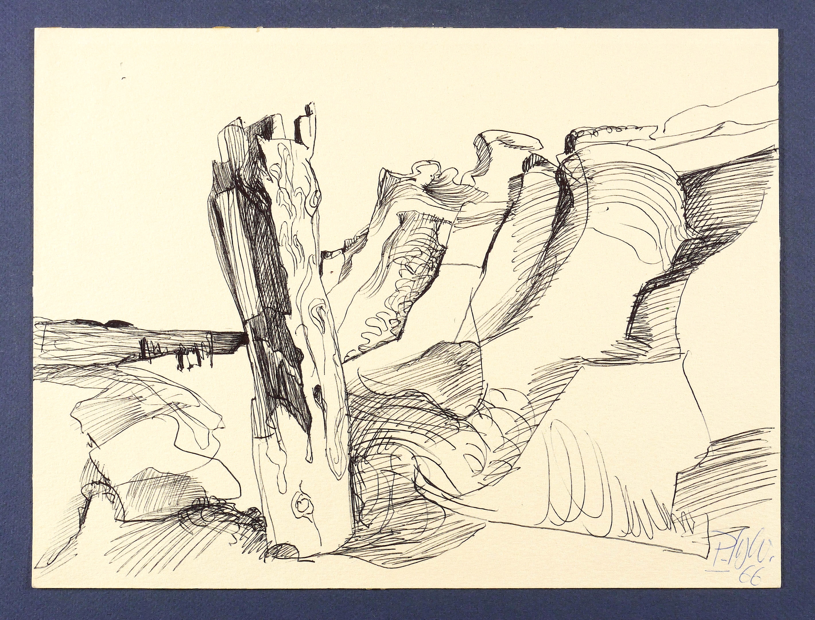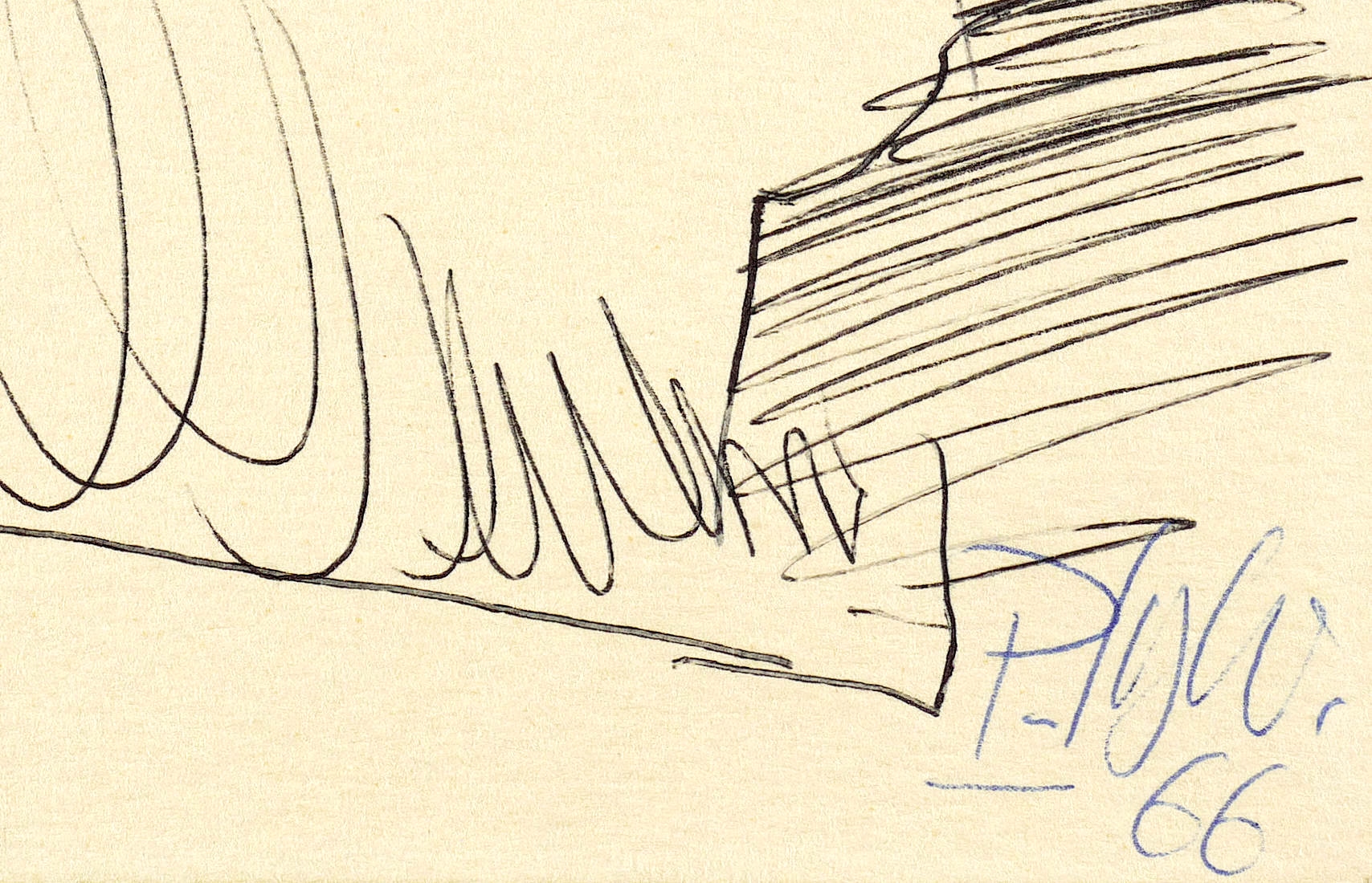 1966. Zeichnung / Kugelschreiber, in Schwarzblau, auf gelblichem Aquarellkarton. – Originale Künstlergrafik, von Peter Sylvester. – Unikat. – 24,0 x 32,0 cm (Darstellung / Blatt).