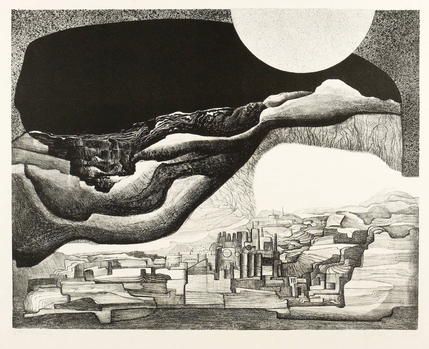 1967. Lithografie / Kreide- & Pinsellithografie, partiell geschabt & gespritzt, auf hellem Karton. – Originale Künstlergrafik, von Peter Sylvester. – Probedruck. – 35,8 x 45,5 cm (Darstellung), 43 x 57 cm (Blatt).