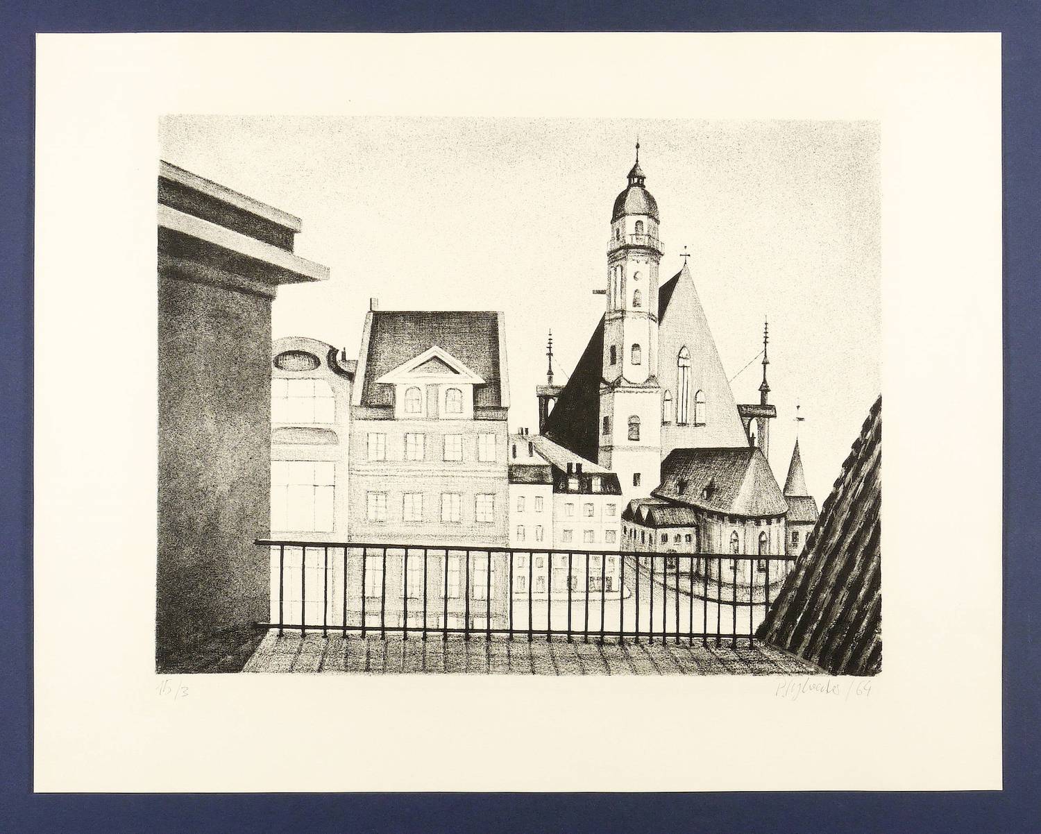 Peter Sylvester (1937 Saalfeld - 2007 Leipzig). Deutscher Maler und Grafiker, bedeutender Vertreter der Leipziger Schule. 1951-54 Ausbildung zum Chemigrafen. In Jena autodidaktische Beschäftigung mit Malerei und Gasthörerschaft am Kunsthistorischen Institut. 1958 Übersiedlung nach Leipzig. Besuch der Abendakademie und der Werkstätten für Lithografie und Radierung der Hochschule für Grafik und Buchkunst (HGB). Seit 1964 freischaffend. 1972 Mitbegründer der 'Leipziger Grafikbörse', deren Vorsitzender er ab 1991 war. Das grafische Werk ist durch die experimentelle Erweiterung klassischer Drucktechniken geprägt. Zuerst entstanden Radierungen, dann fotomechanisch bearbeitete Serigraphien. Ab 1976 bearbeitete er Aquatinta-Radierungen mittels des im Zentralinstitut für Isotopen- und Strahlenforschung der Akademie der Wissenschaften der DDR entwickelten Geräts 'Densitron' - eine Vorform computerbasierter Bildbearbeitung. In seinen Chaoslandschaften durchdringen sich Motive der Phantastik, der Umweltkritik und der Harmoniesehnsucht. Das grafische Werk Sylvesters wurde durch zahlreiche nationale und internationale Ausstellungen sowie namhafte Kunstpreise gewürdigt.