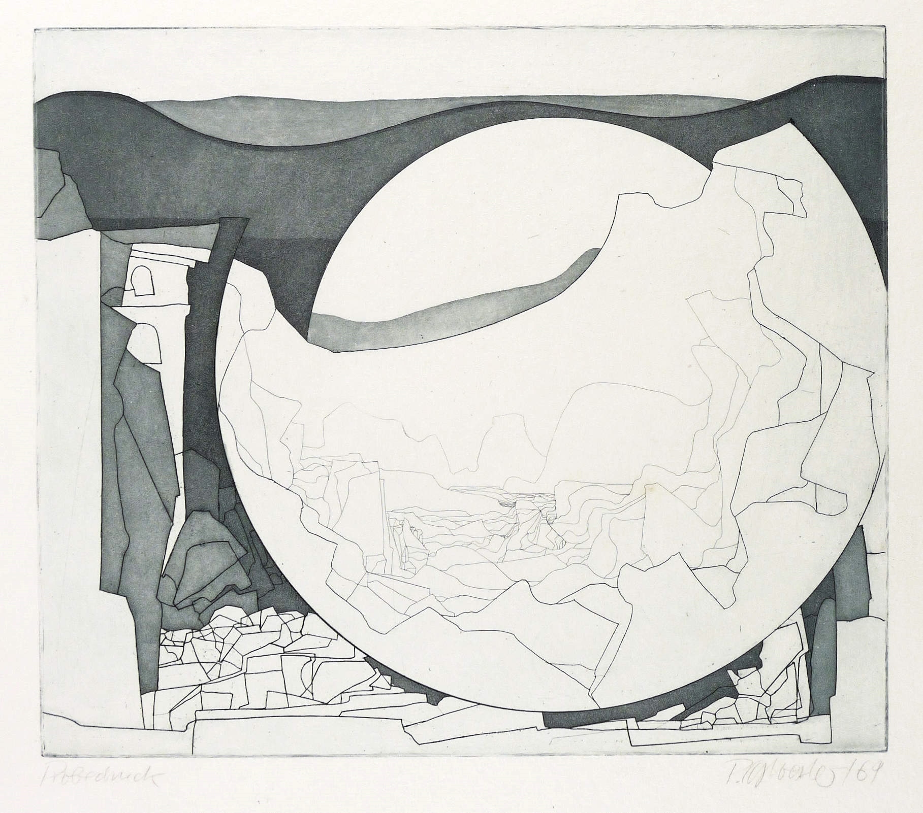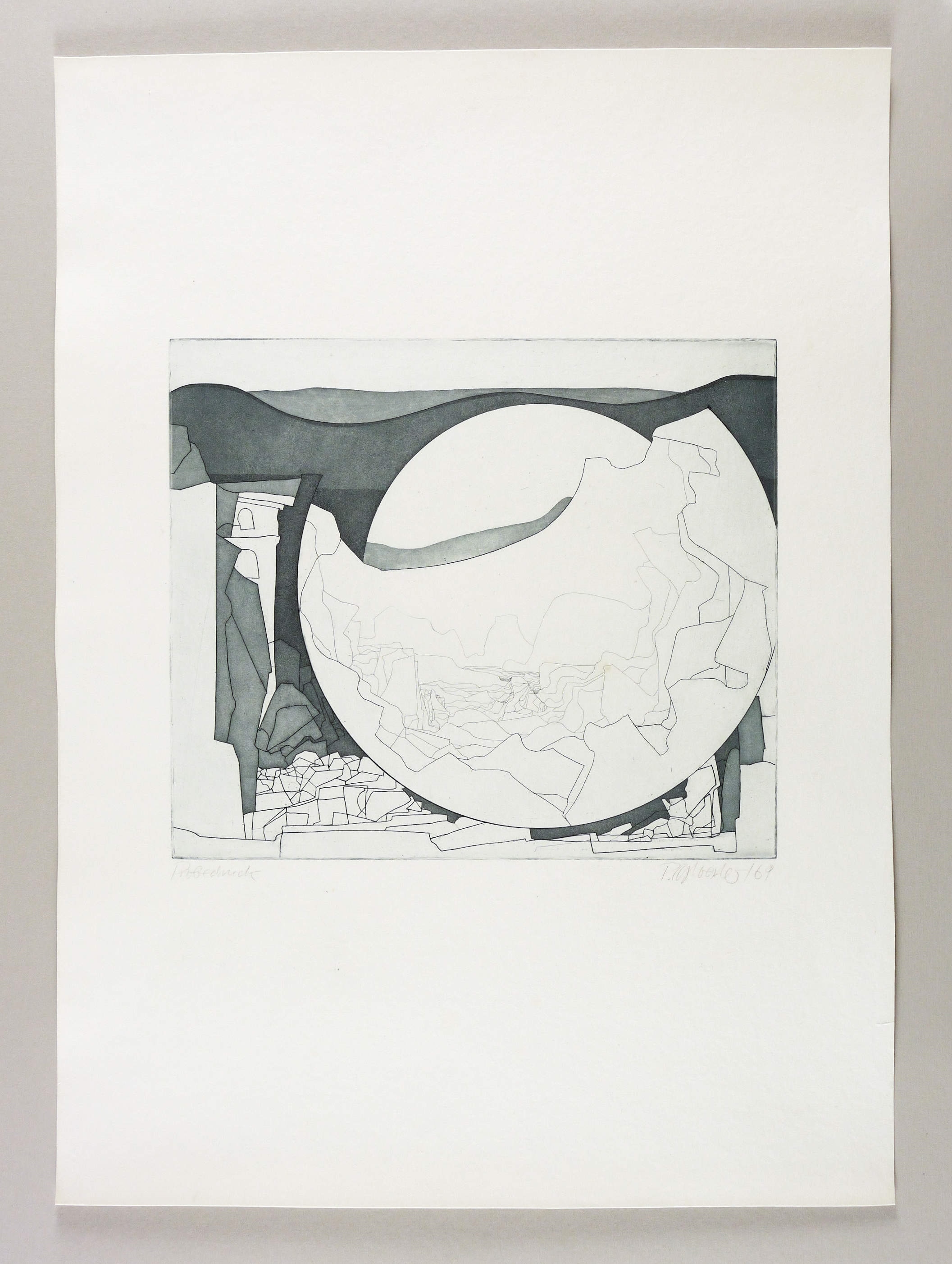 1969. Radierung / Strichätzung & Aquatinta, in Schwarz, auf Weißenborn-Bütten. – Originale Künstlergrafik, von Peter Sylvester. – Probedruck. – 29,1 x 34,1 cm (Darstellung / Platte), 65 x 47 cm (Blatt).