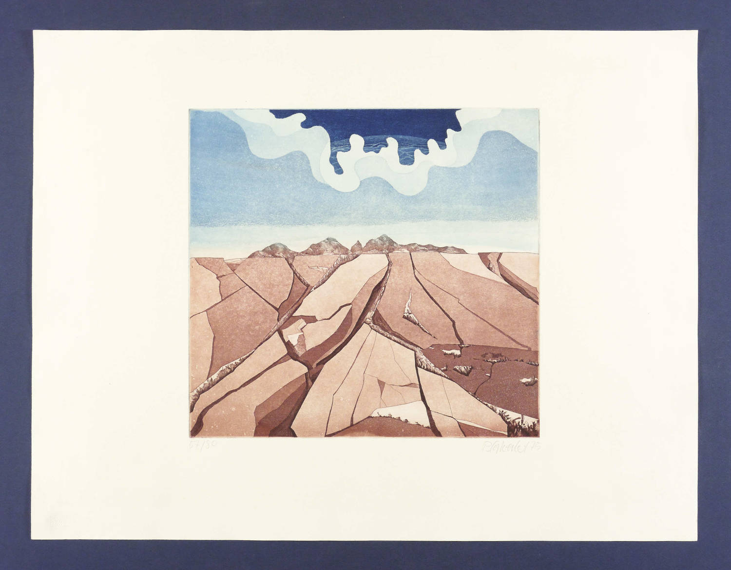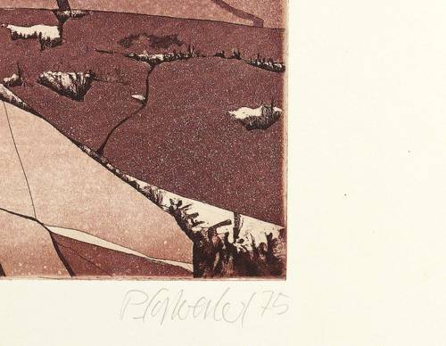 1975. Farbradierung / Farbaquatinta, in Aubergine & Blau, auf Weißenborn-Bütten. – Originale Künstlergrafik, von Peter Sylvester. – Auflage Exemplar Nr. 57/80. – 32,2 x 34,3 cm (Darstellung / Platte), 50 x 65 cm (Blatt).